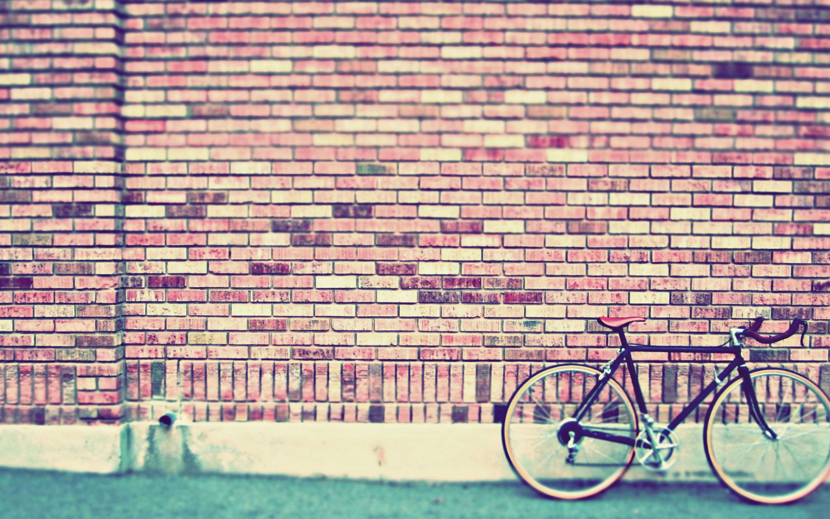 Description: A bike parked next to a brick wall on a street corner with a sidewalk in front of it and a brick wall behind it.