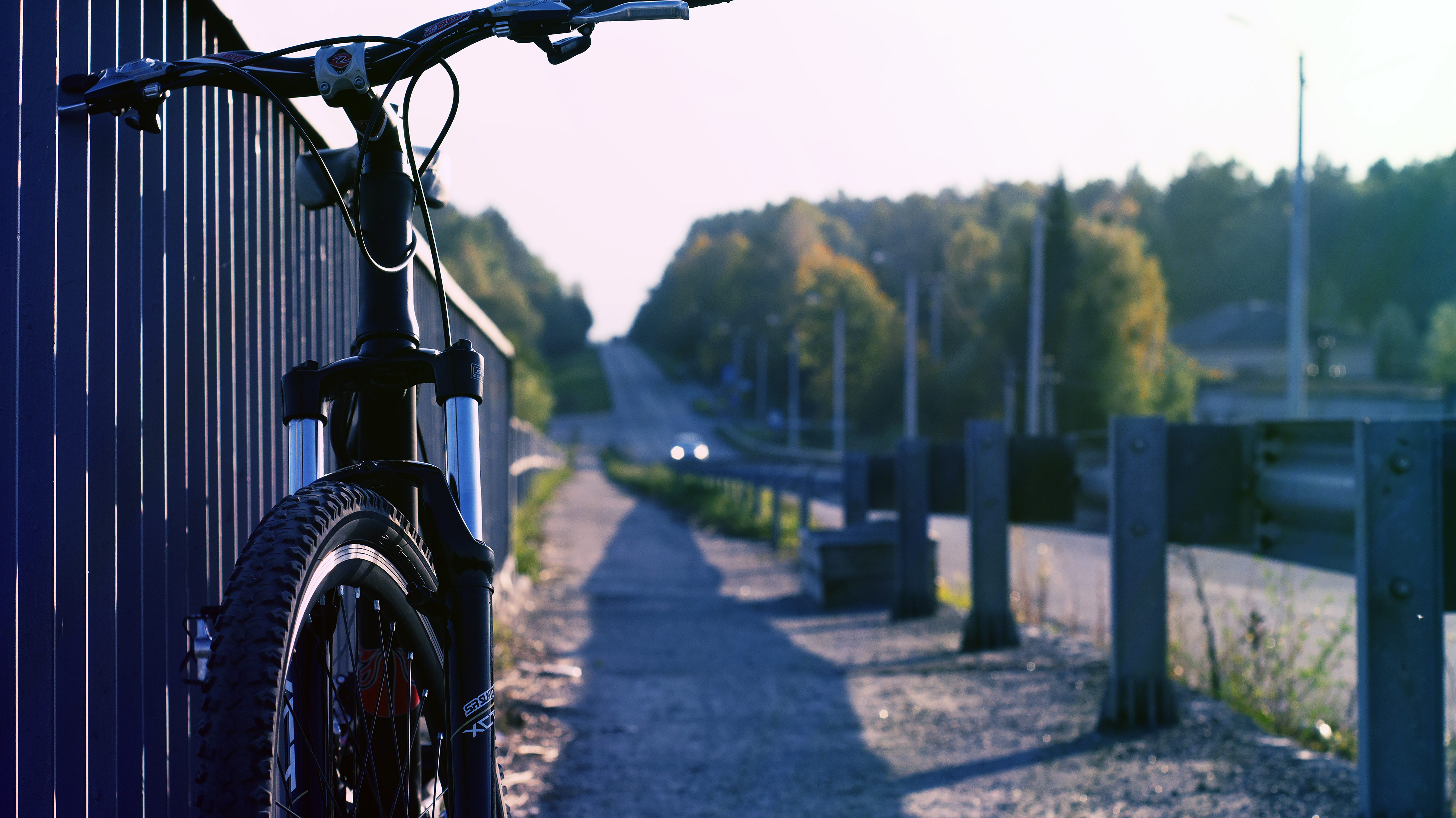 Description: A bike parked next to a fence on a road side road with trees in the background and a blue fence.