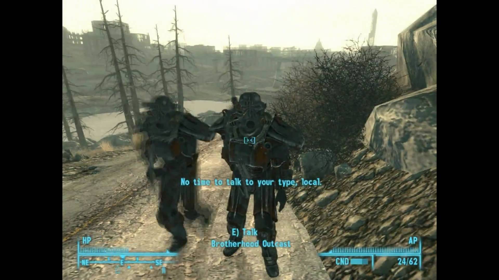 Description: A video game scene of two people riding bikes on a dirt road with a city in the background and a text that reads.