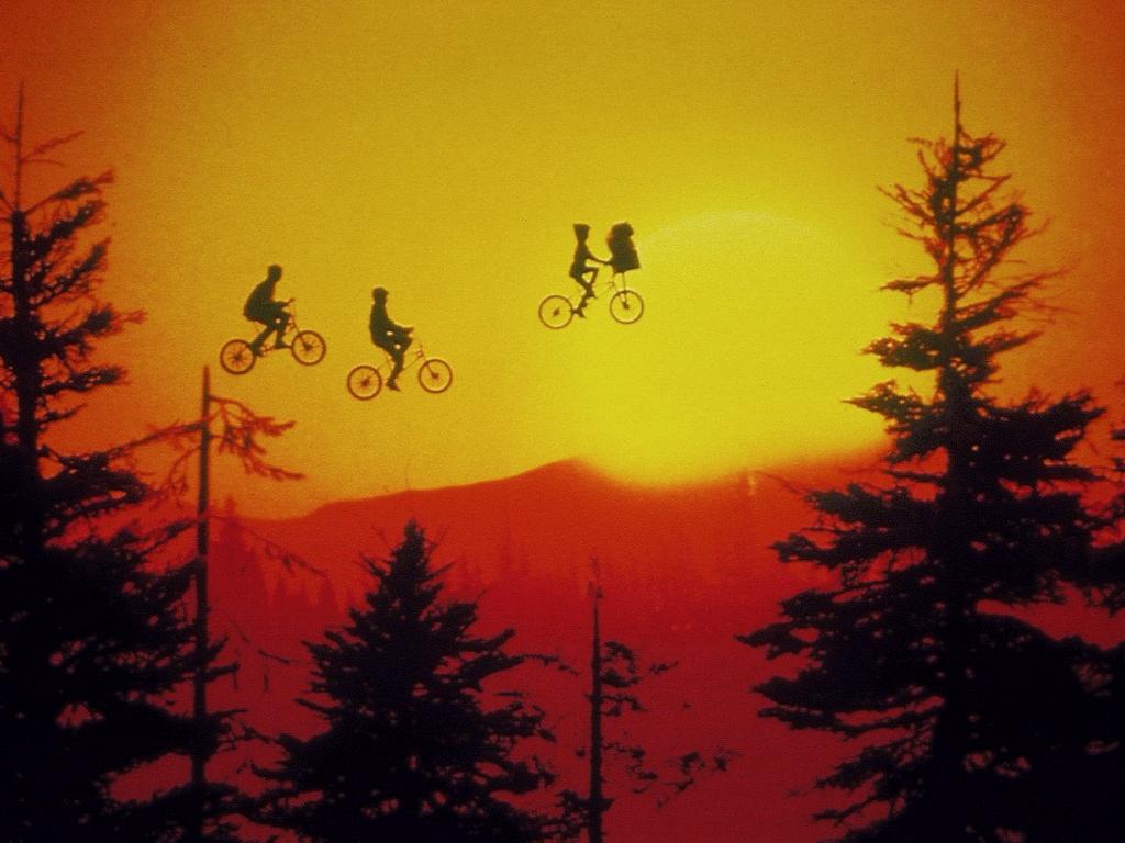 Description: A group of people riding bikes over a forest at sunset with the sun setting in the background and a person on a bike.