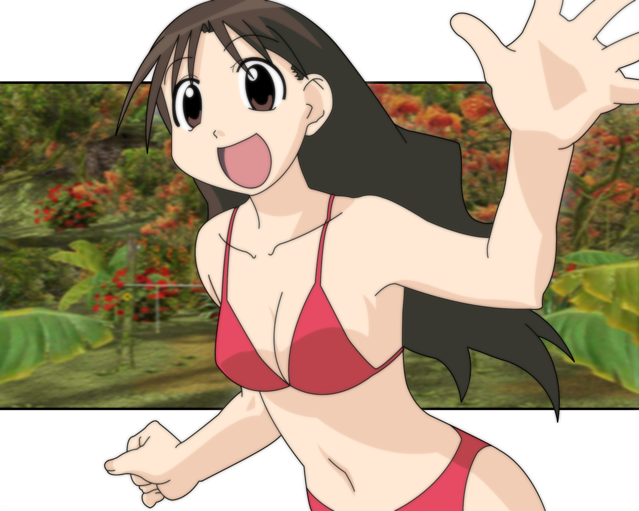 Description: A woman in a bikini is waving her arms out to the side of the picture.