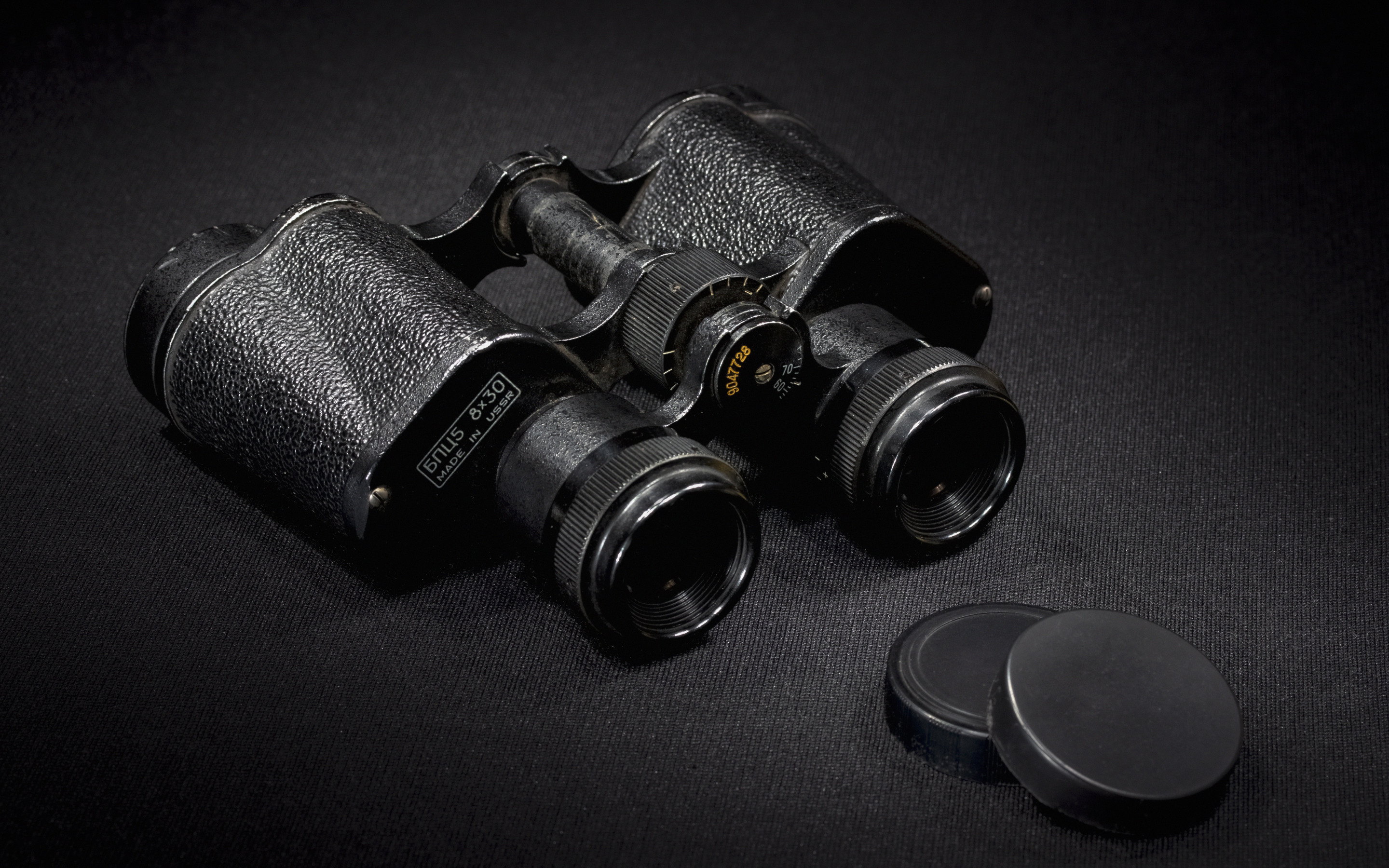 Description: A pair of binoculars sitting on top of a table next to a button and a pair of glasses on top of a table.