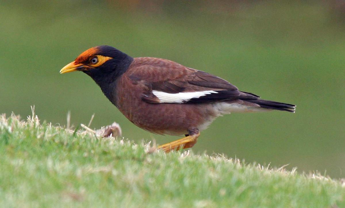 Description: A bird with a yellow beak standing on a grassy hill side area with a blurry background of grass and a small bird with a yellow beak.