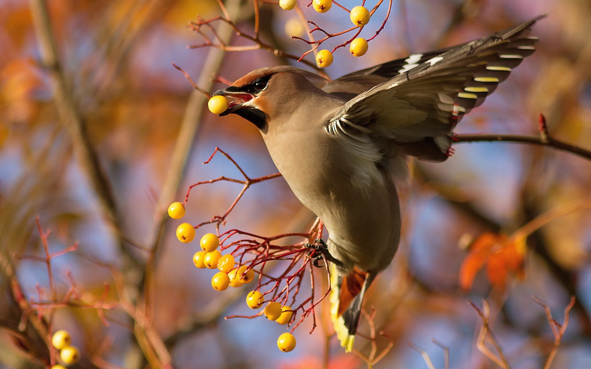 Description: A bird is perched on a branch with berries on it's branches and a blue sky in the background.