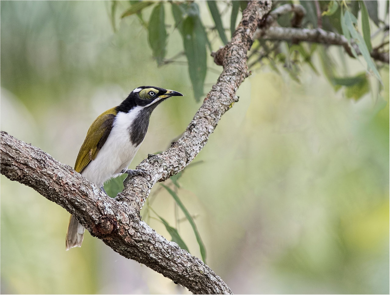 Description: A bird perched on a branch of a tree in a forest area with green leaves and a blurry background.