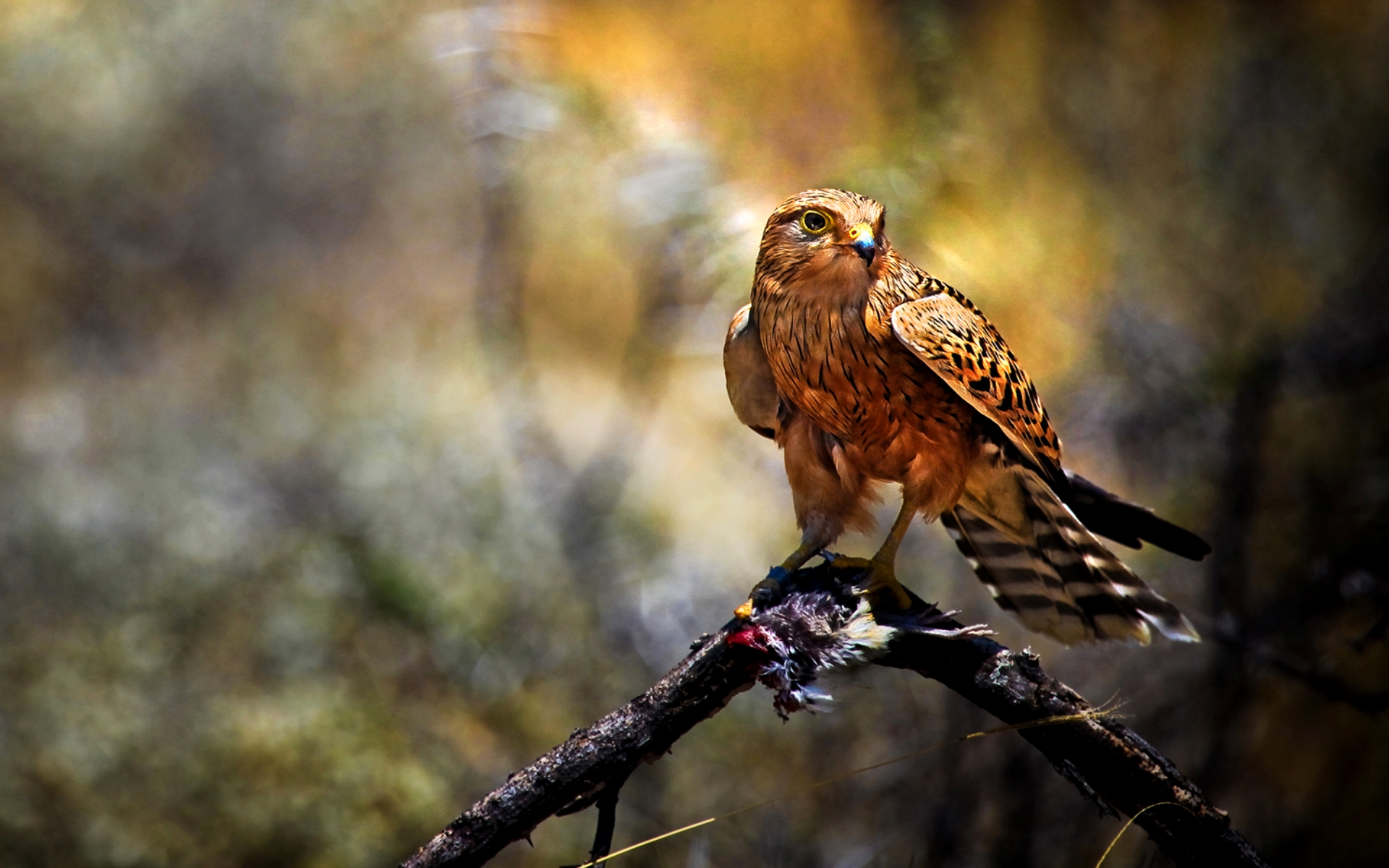 Description: A bird sitting on a branch in a forest with trees in the background and a blurry background of leaves.