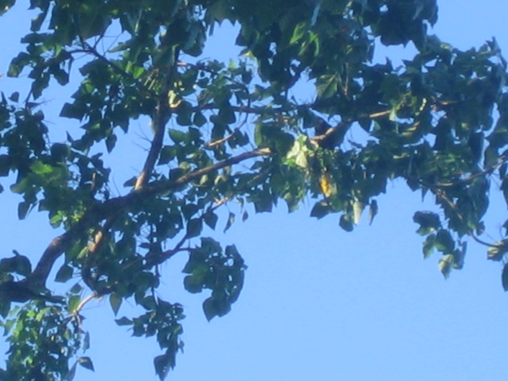 Description: A bird sitting on a branch of a tree with leaves on it's branches and a blue sky in the background.