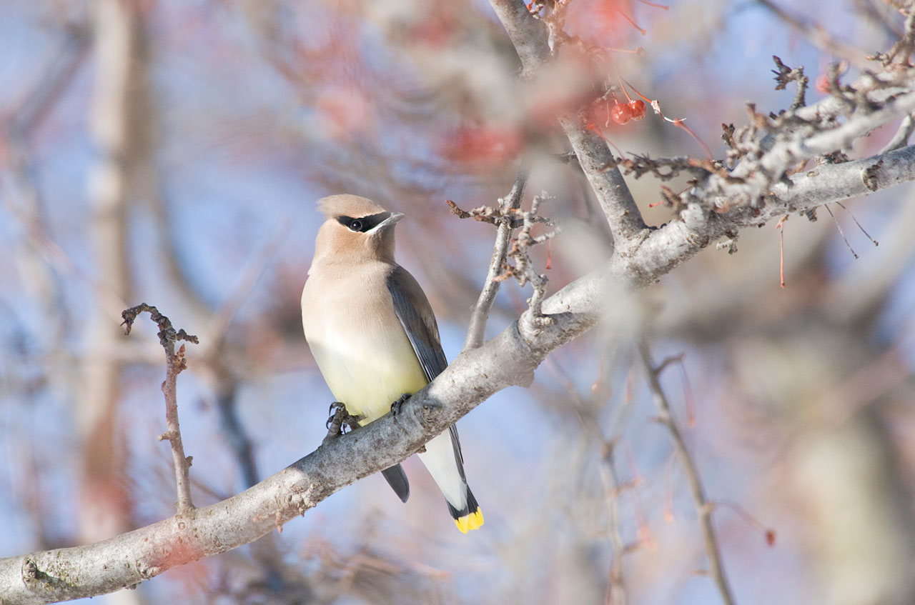Description: A bird sitting on a branch of a tree with red berries on it's branches and a blue sky in the background.