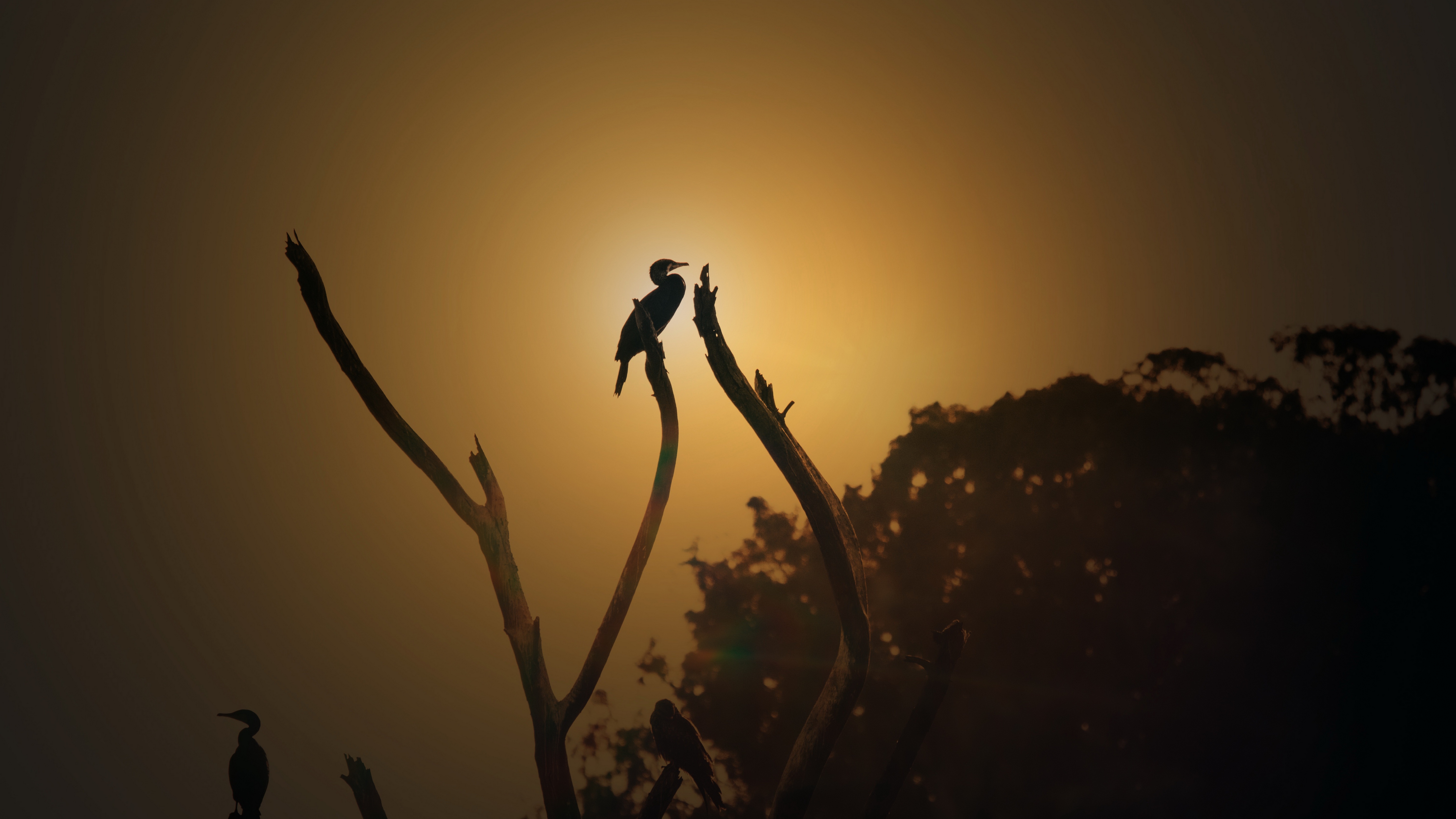 Description: A bird sitting on a tree branch in the sun setting behind it.