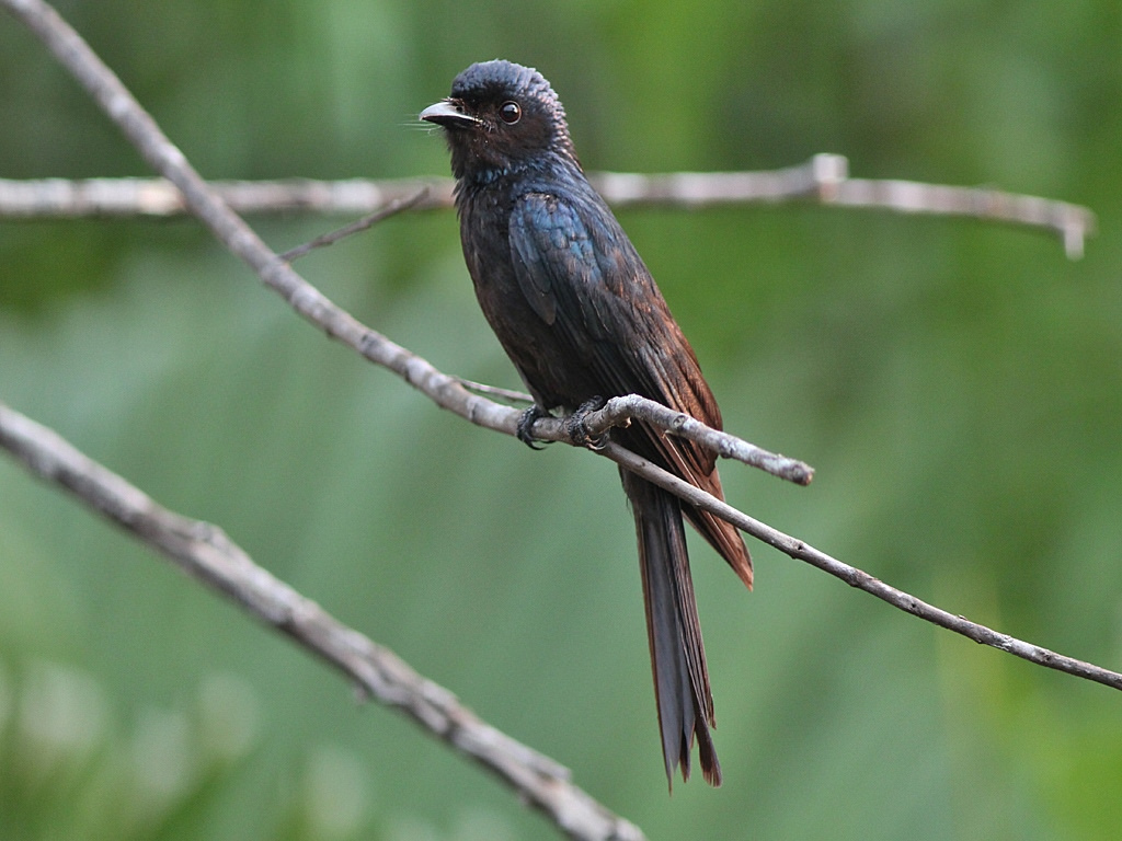Description: A bird sitting on a branch in a tree with green leaves in the background and a blurry background.