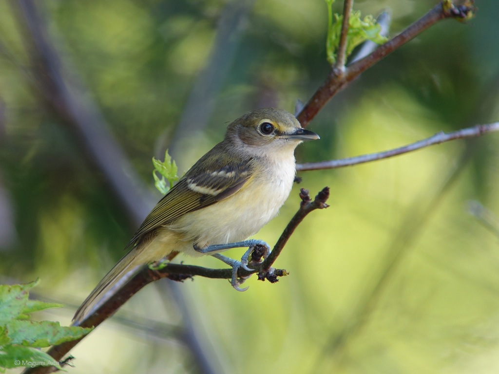 Description: A bird sitting on a branch of a tree with leaves on it's branches and a blurry background.