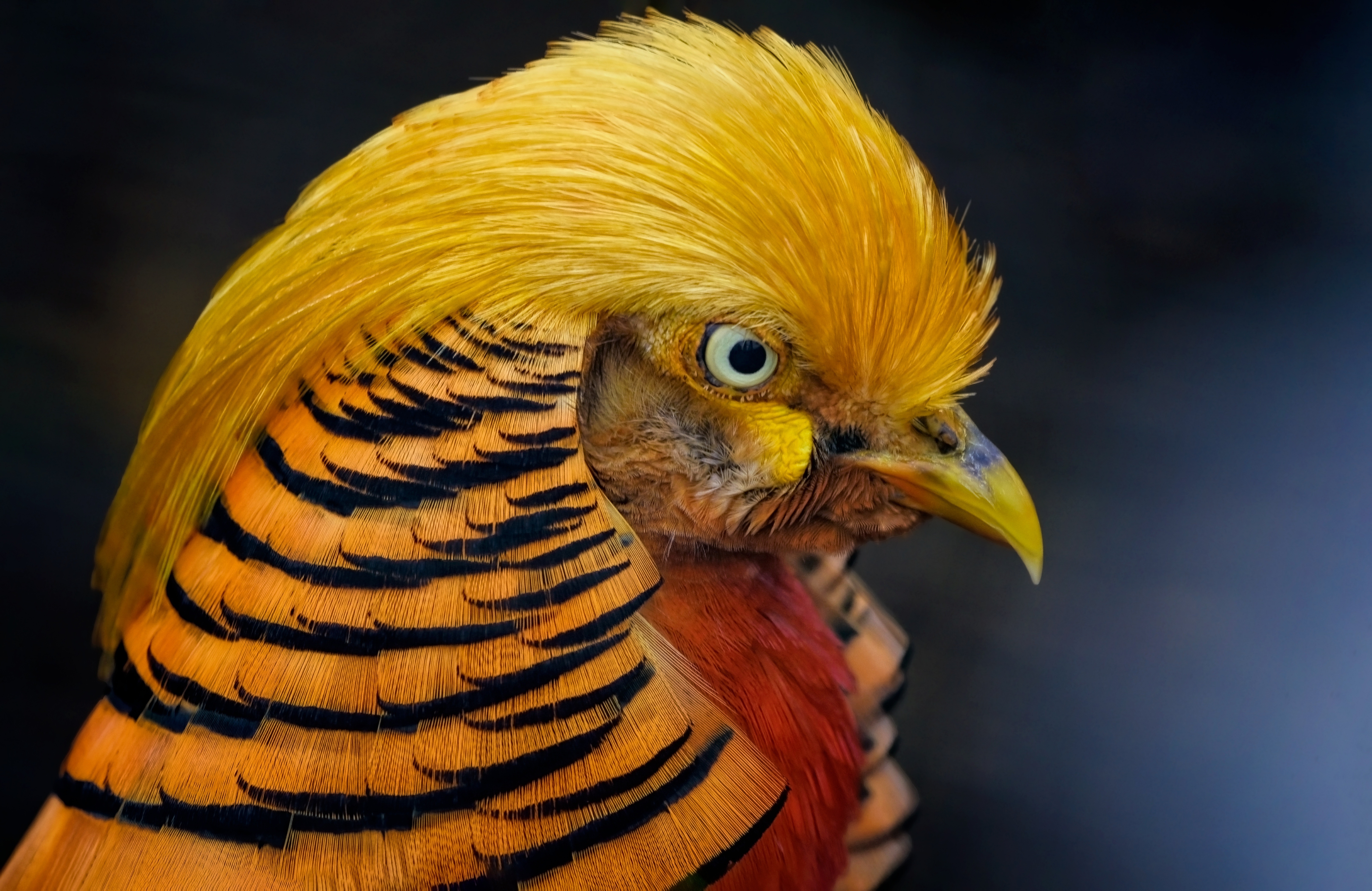 Description: A close up of a bird with a yellow and black feathers on it's head and neck and a black background.