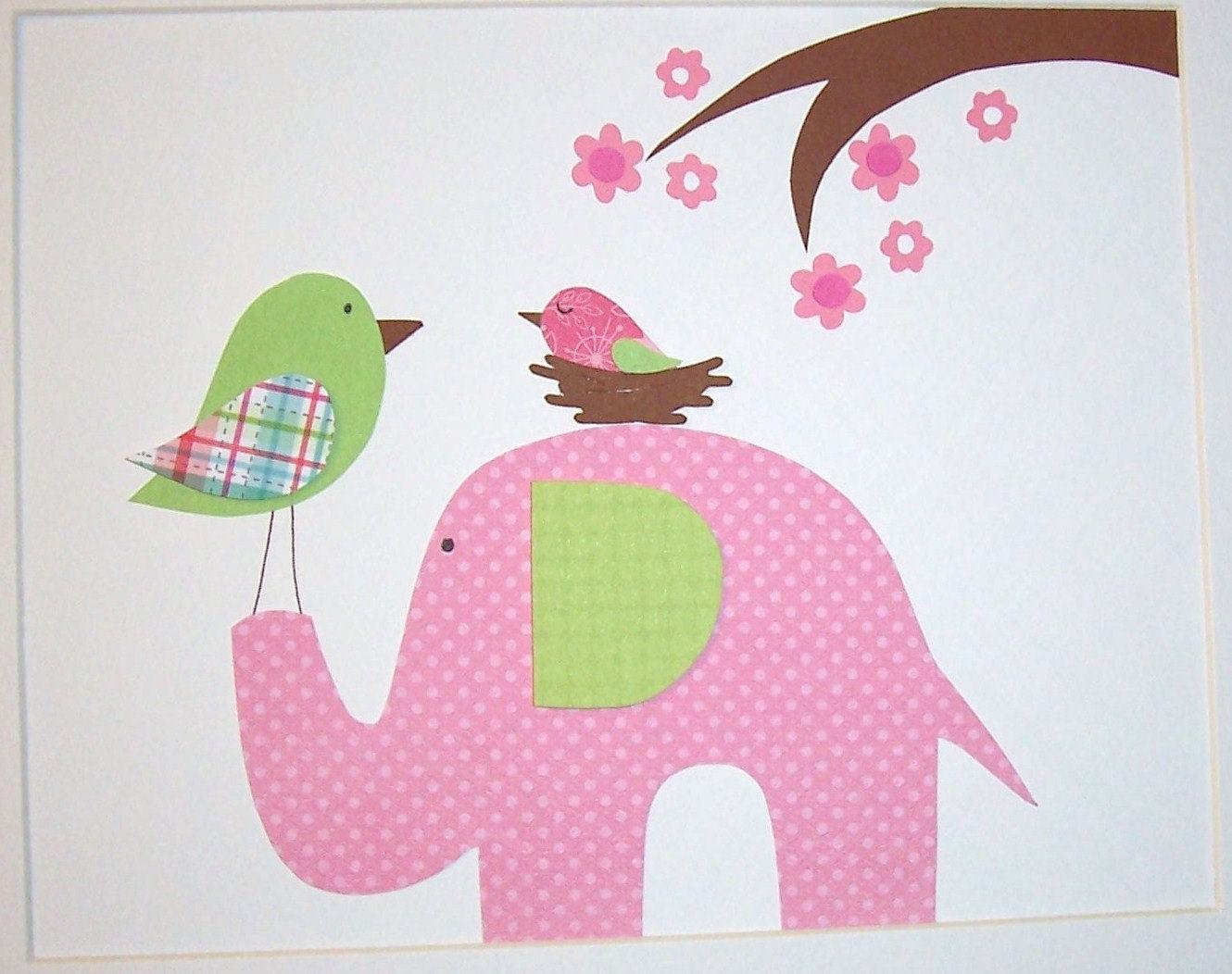 Description: A picture of a bird and a elephant with flowers on it's back and a tree branch on top.