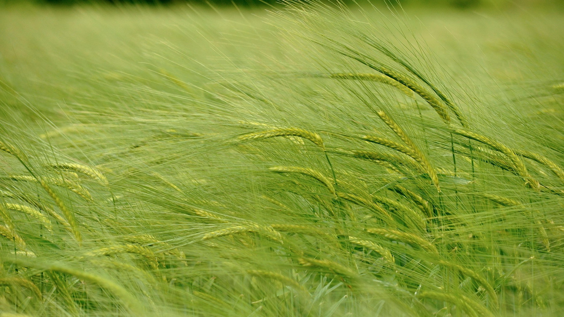 Description: A field of green grass with a blurry background of trees in the background and a bird in the foreground.