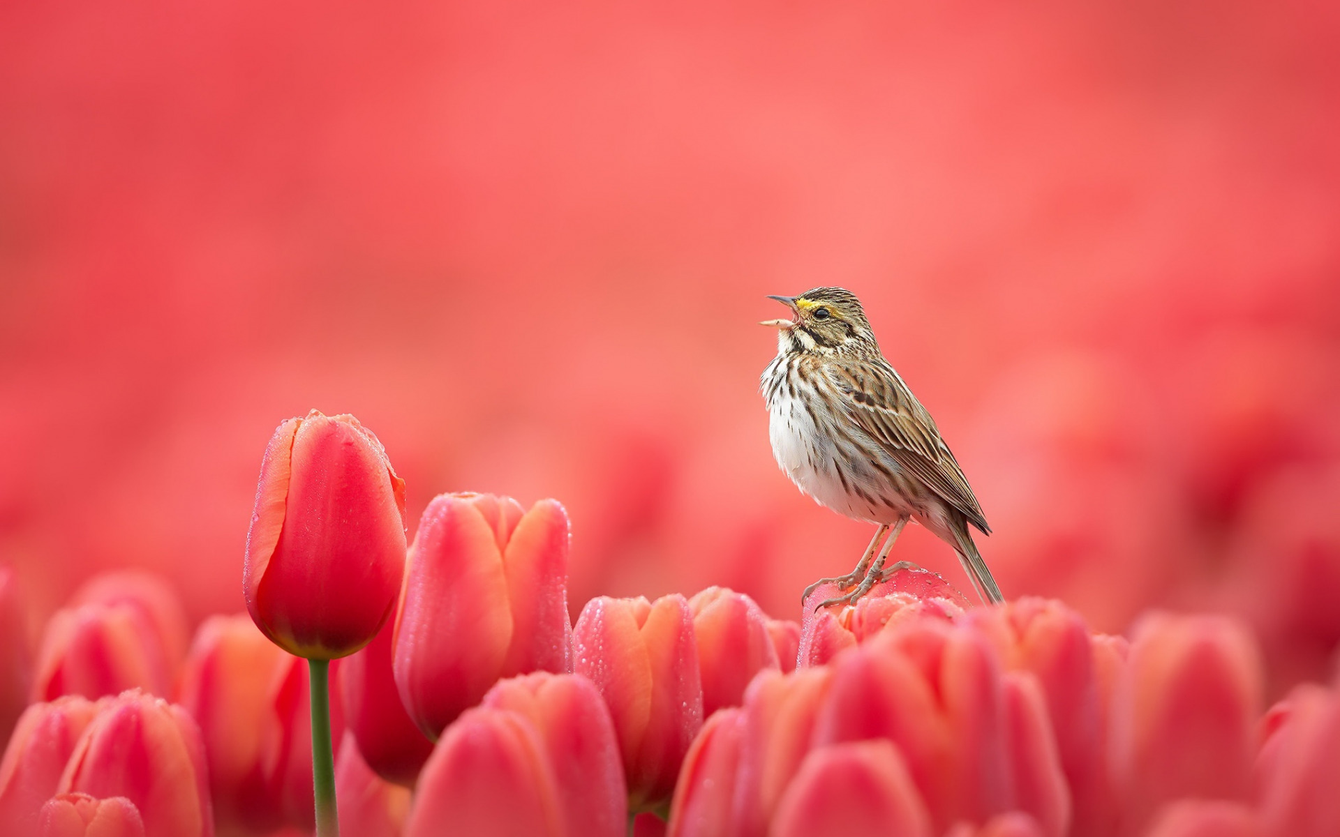 Description: A bird is sitting on a flower in a field of red tulips with a pink background that is almost obscured by the flowers.
