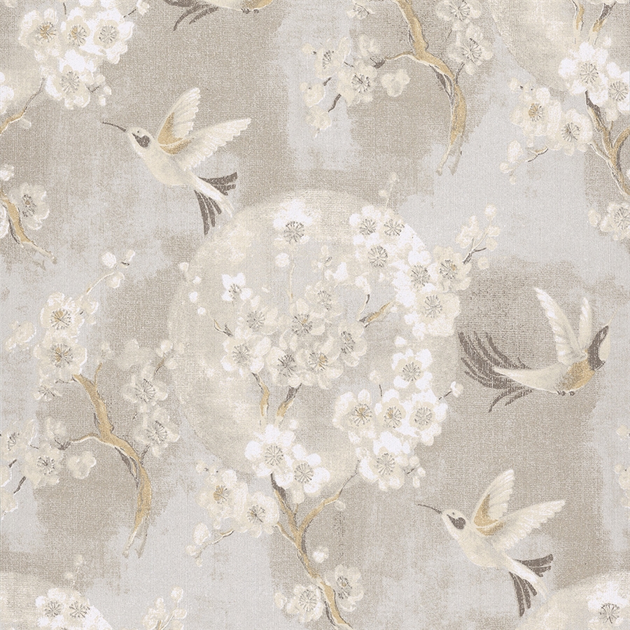 Description: A bird and flower pattern on a gray background with white flowers and a bird flying over it in the air.