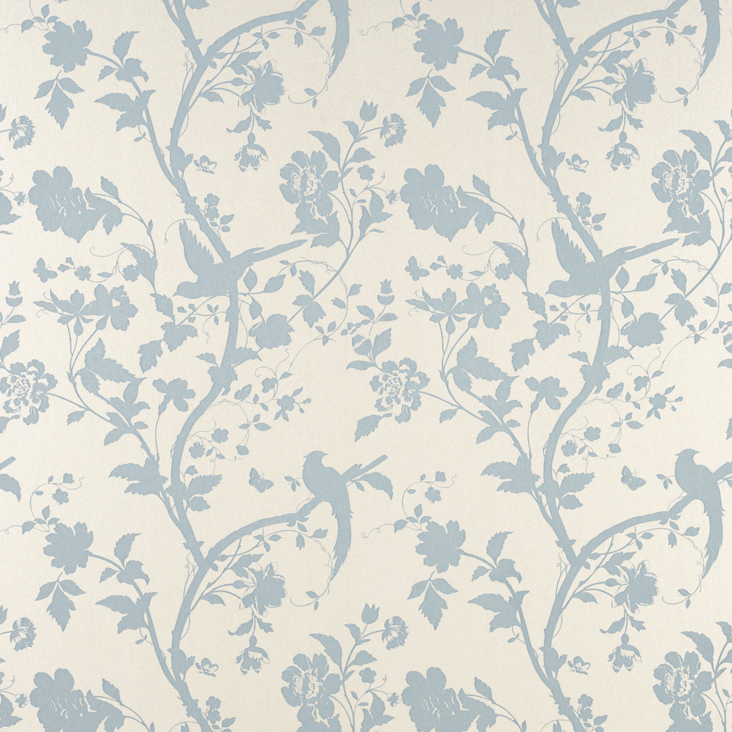 Description: A wallpaper with a bird and flowers on it in blue and white colors.