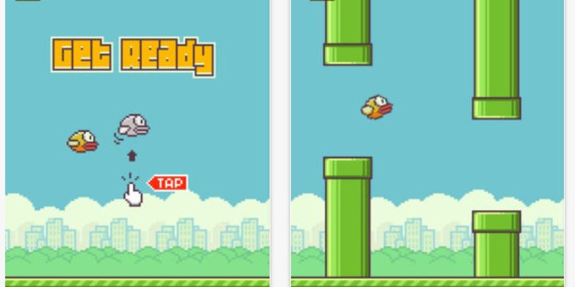 Description: A game with a bird flying over a city and a bird flying over the ground.