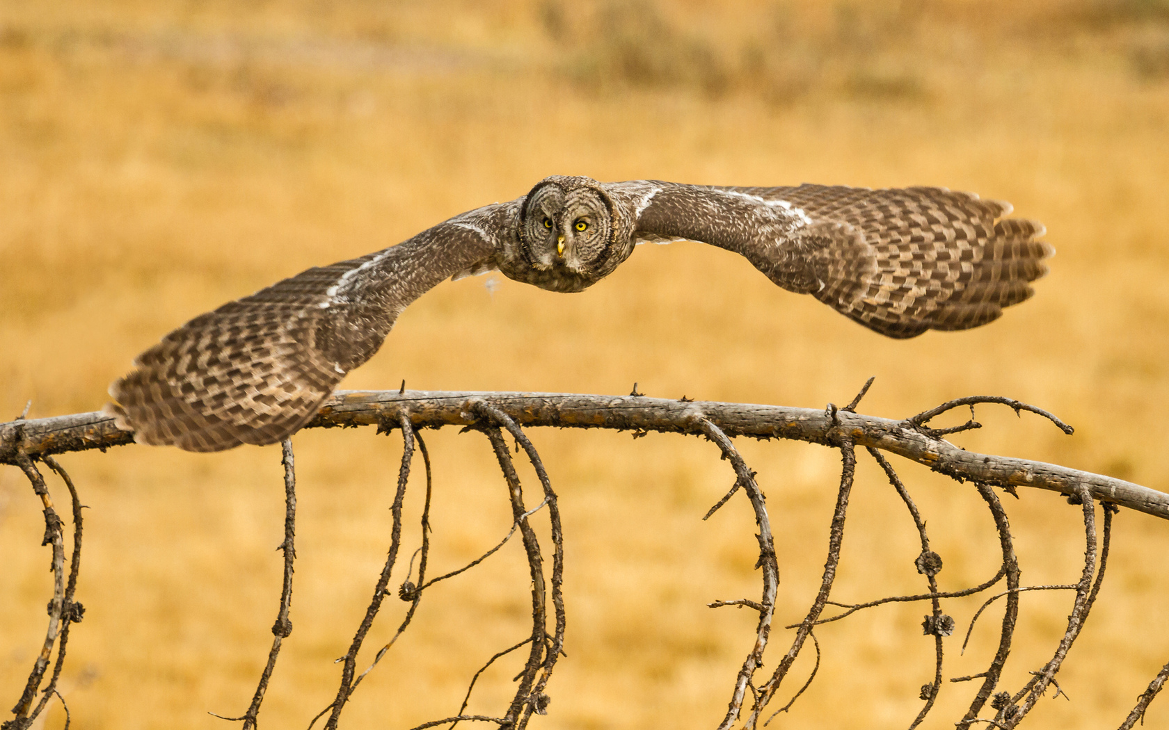 Description: A bird is flying over a branch in a field of grass and dry grass.