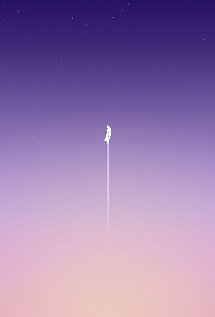 Description: A bird flying through the air on a purple and pink background with stars above it and a white line in the sky.