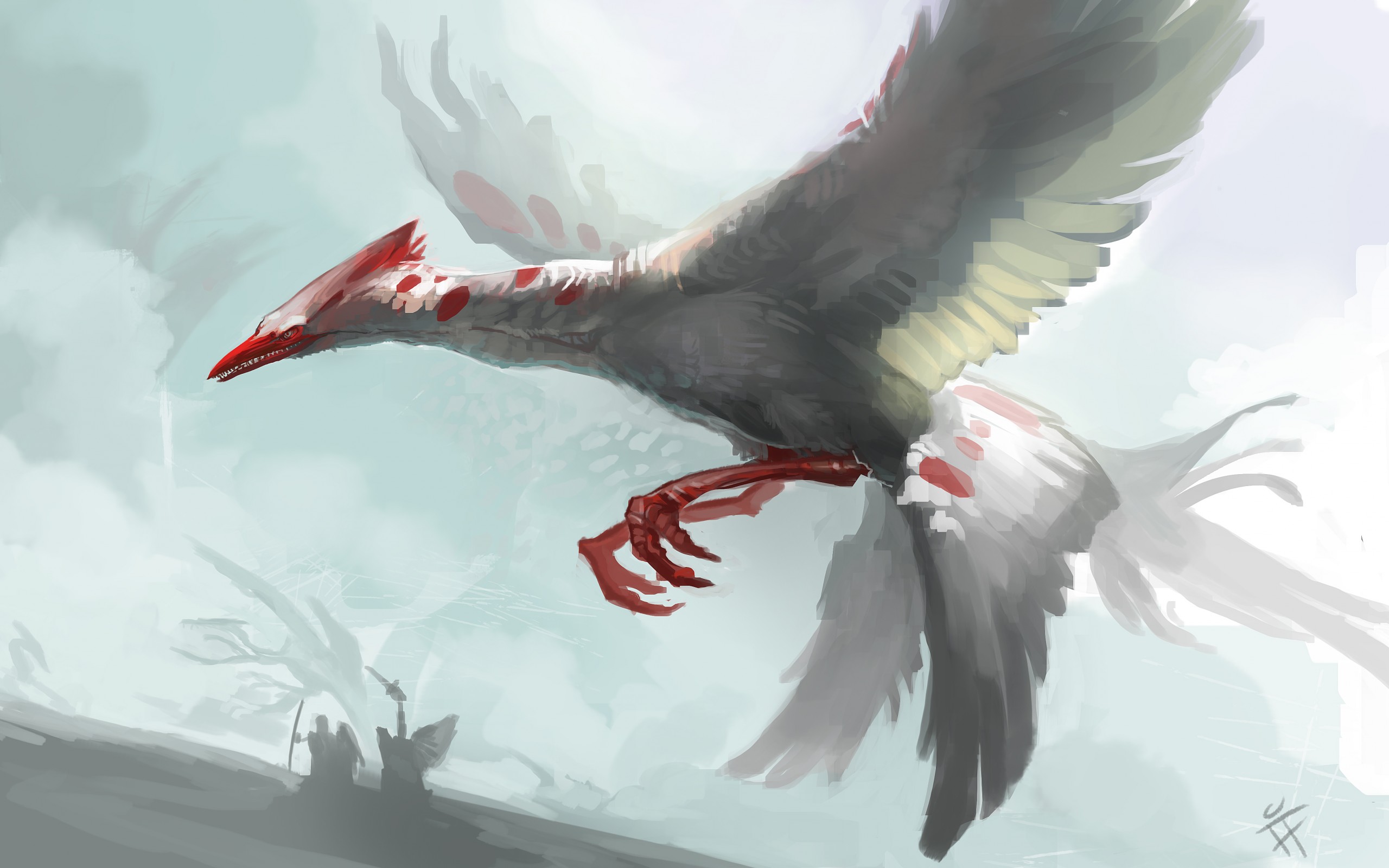 Description: A bird with a red beak flying through the air with wings spread out and claws out of its beak.