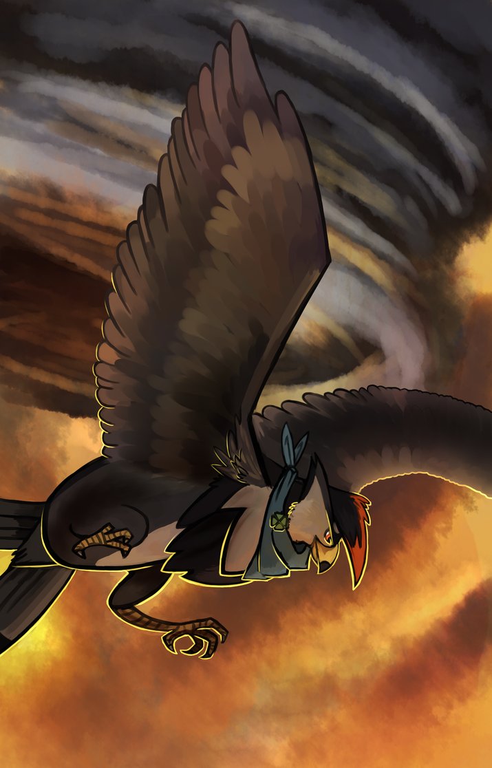 Description: A bird flying through the air with a sky background behind it and clouds in the background with a bird flying in the air.