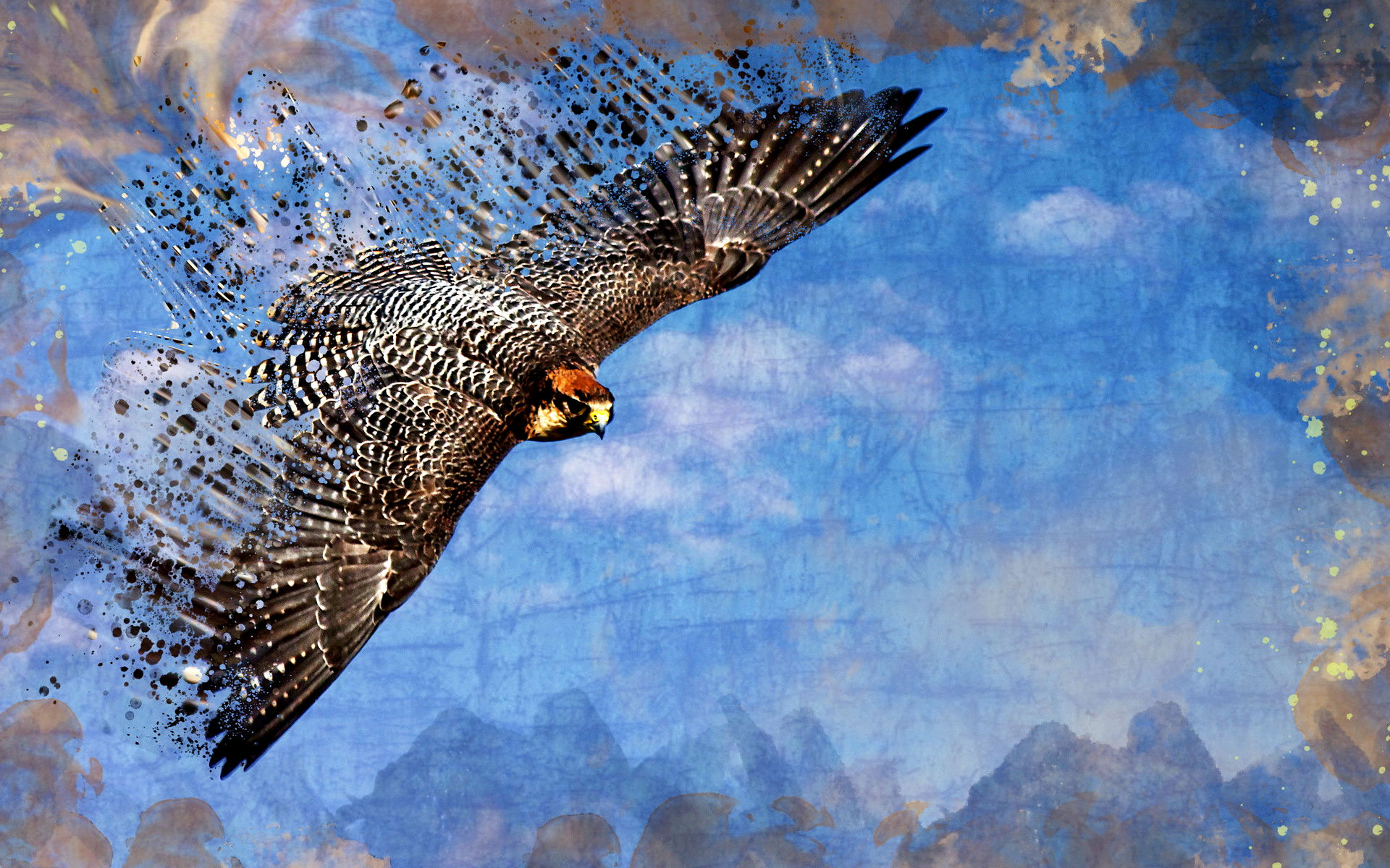 Description: A bird flying through the air with a sky background behind it and clouds in the background with a blue sky.