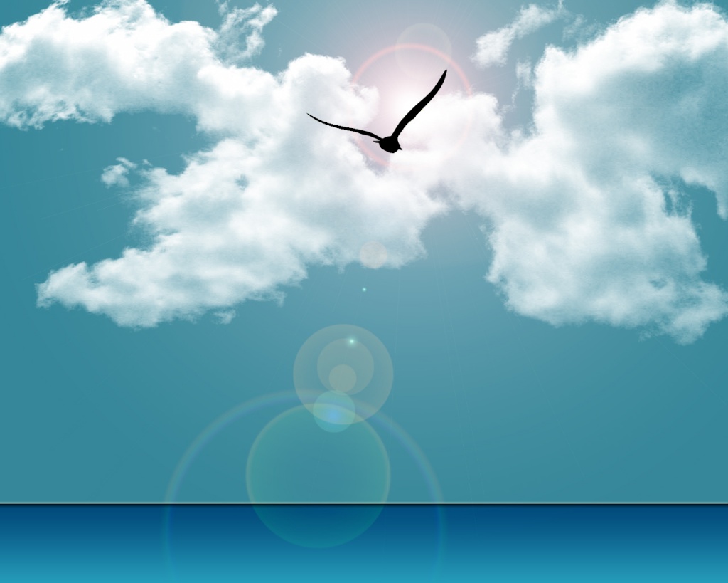 Description: A bird flying through the sky above the ocean under a cloudy blue sky with sun rays and a bird flying in the sky.