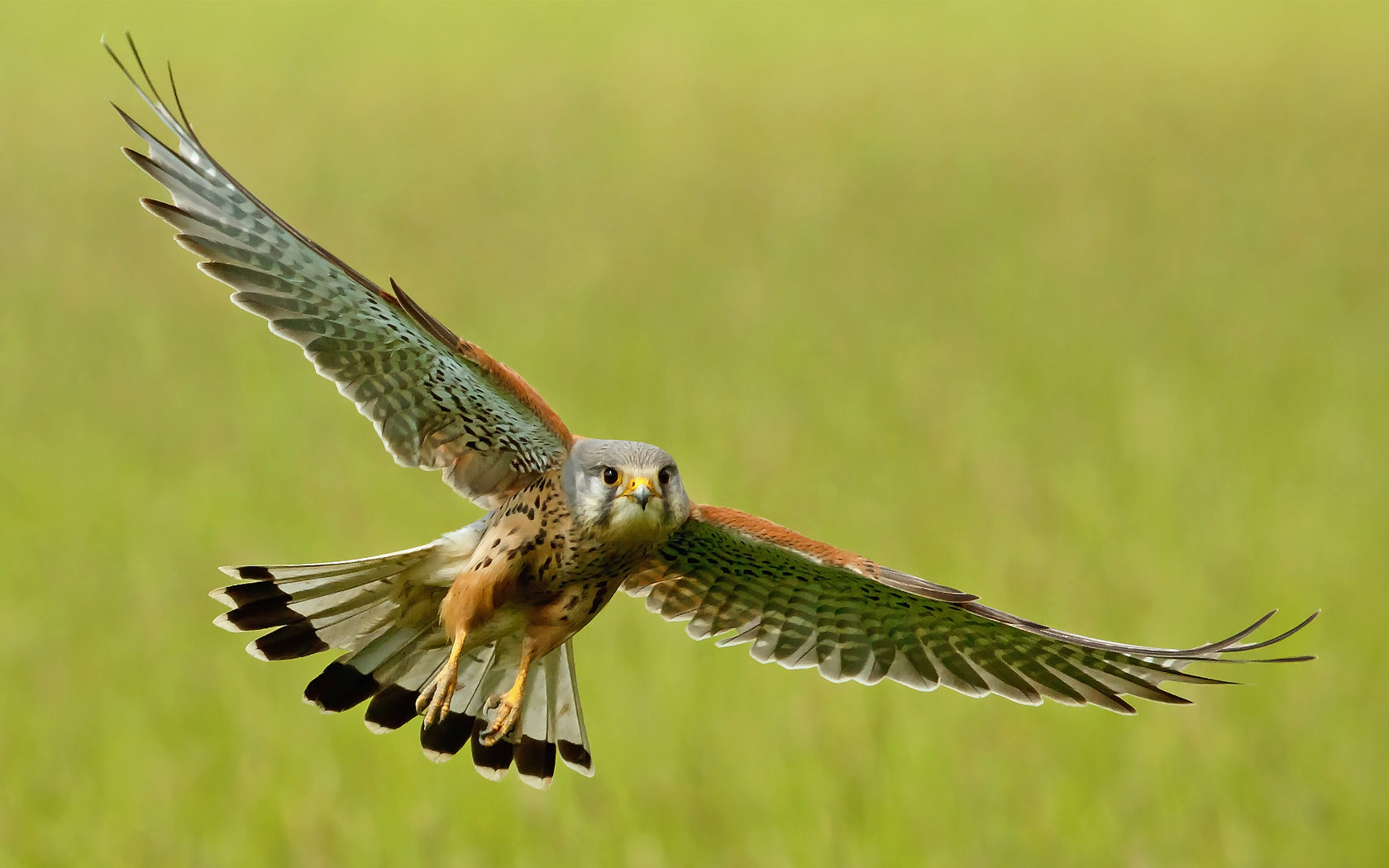 Description: A bird flying through the air with its wings spread out in a field of grass and tall grass behind it.