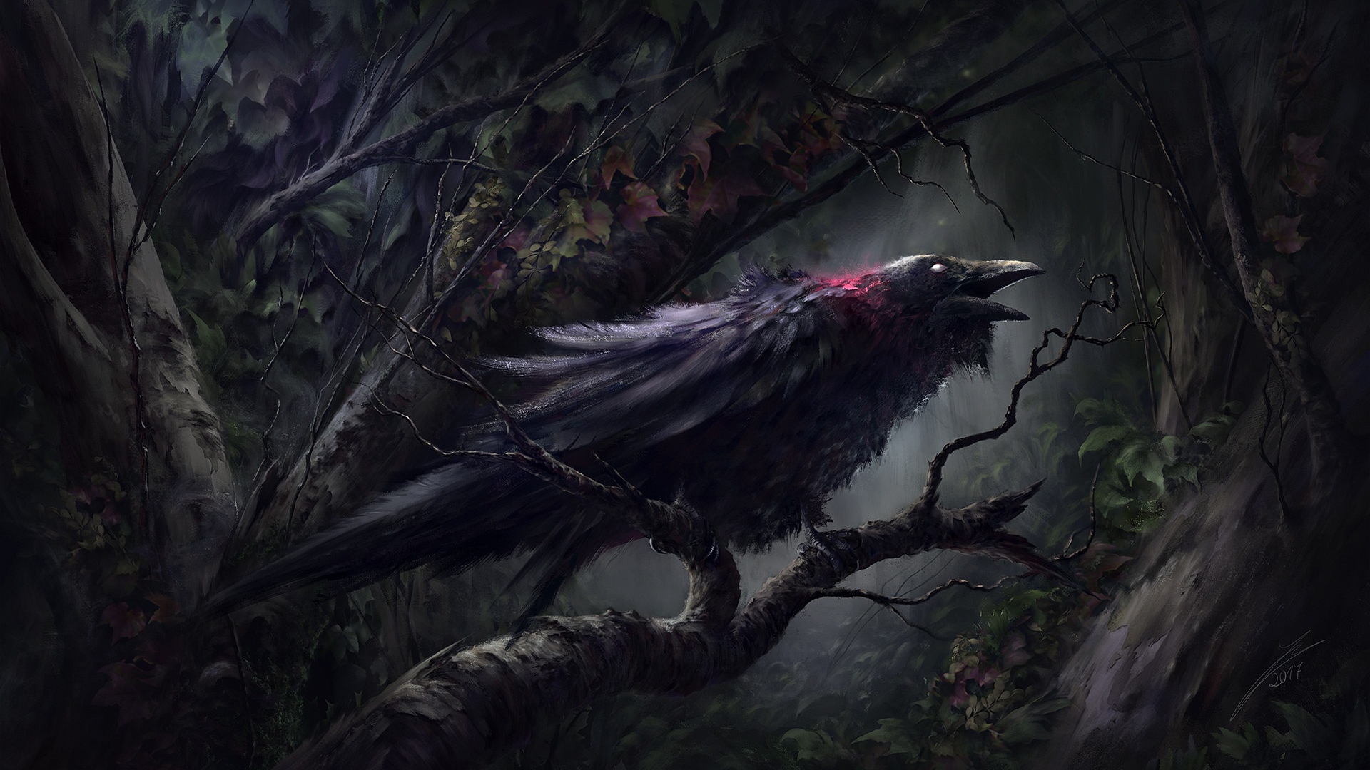 Description: A bird sitting on a branch in a forest with a light shining on it's head and wings.