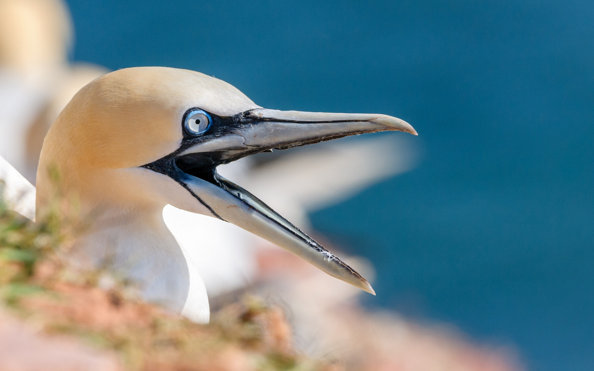 Description: A bird with a long beak and a blue eye is standing on a rock near the water and grass.