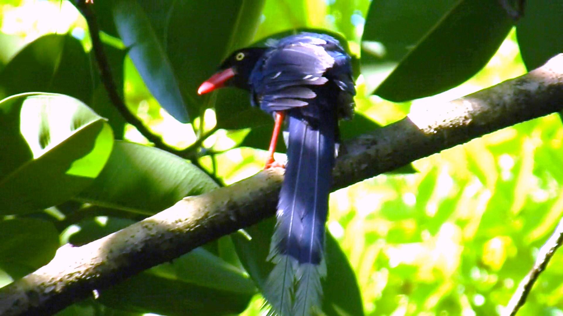 Description: A bird with a long beak sitting on a branch in a tree with leaves in the background and a blurry background.
