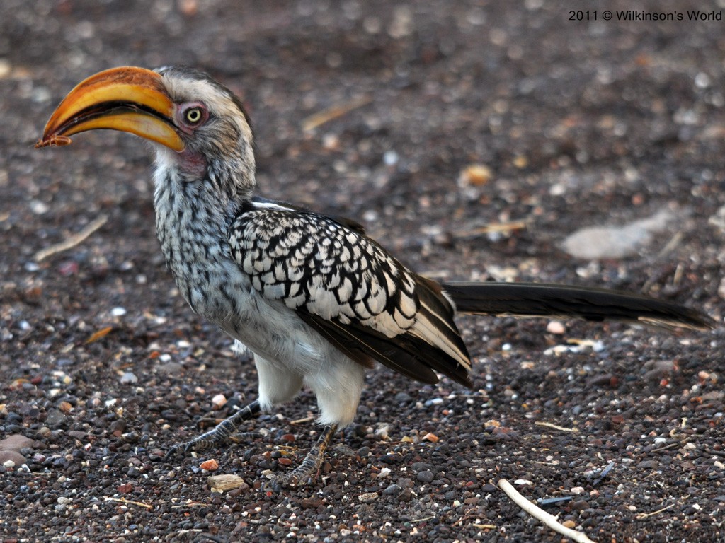 Description: A bird with a long beak standing on a gravel ground with a yellow beak and black wings and a yellow beak.