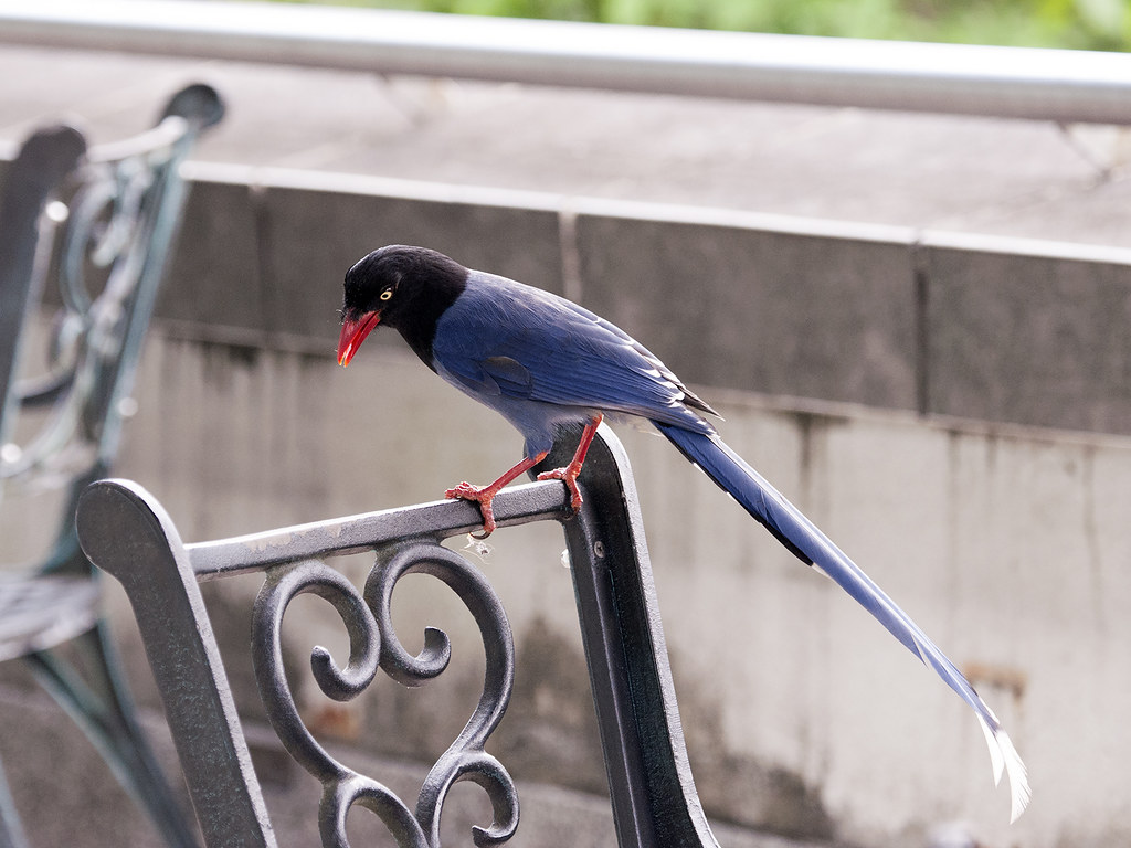 Description: A bird sitting on a metal bench next to a wall and a metal chair with a red beak and tail.