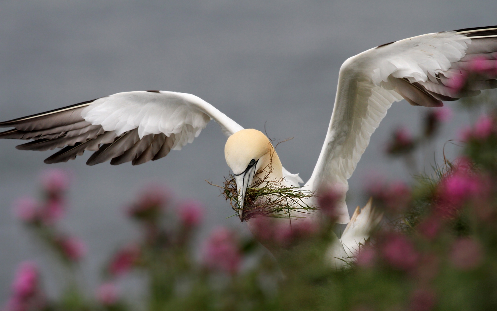 Description: A bird with a nest in its beak in a field of flowers with a gray sky background and a few pink flowers.