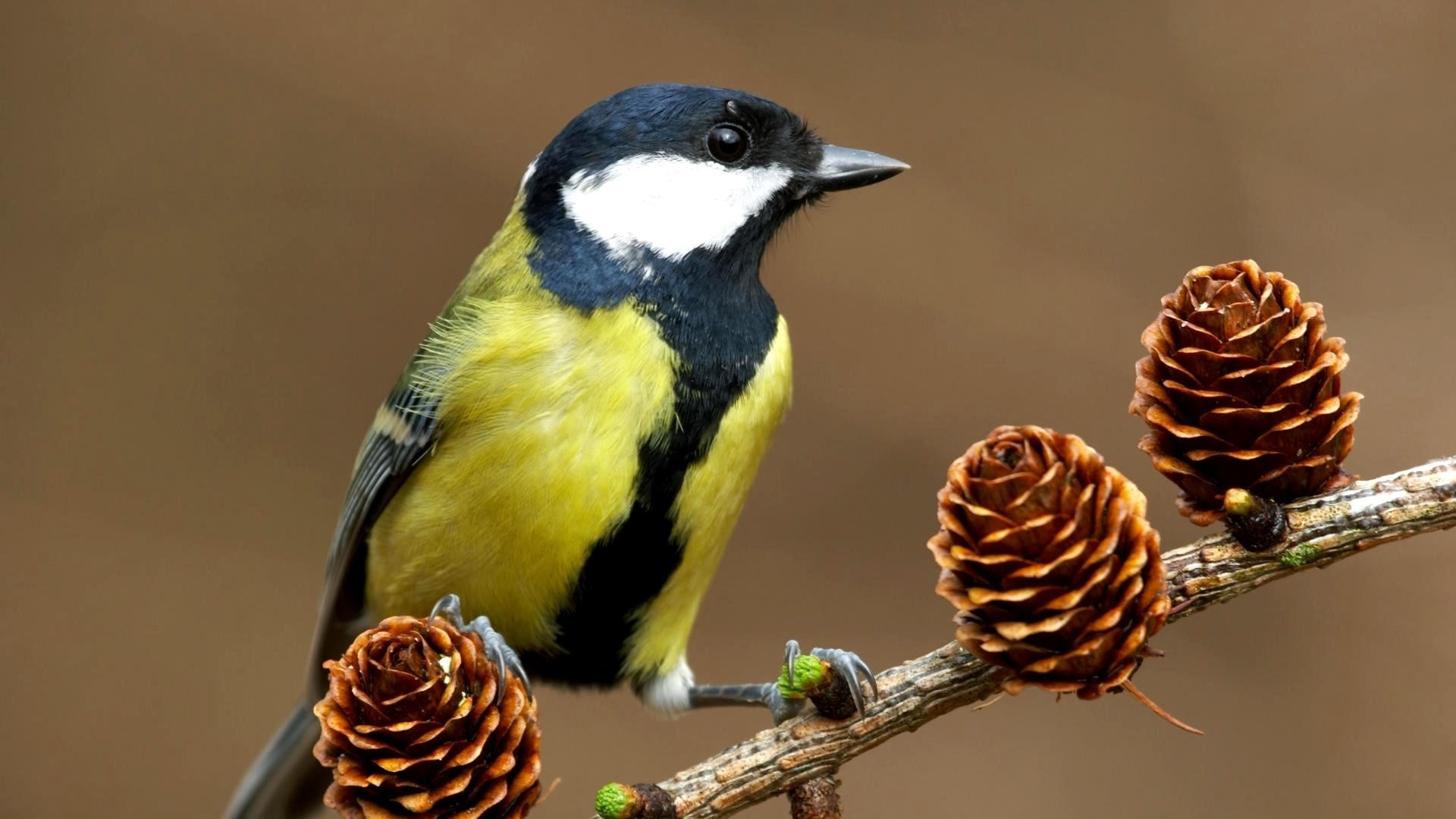 Description: A bird perched on a branch with pine cones on it's branch and a brown background behind it.