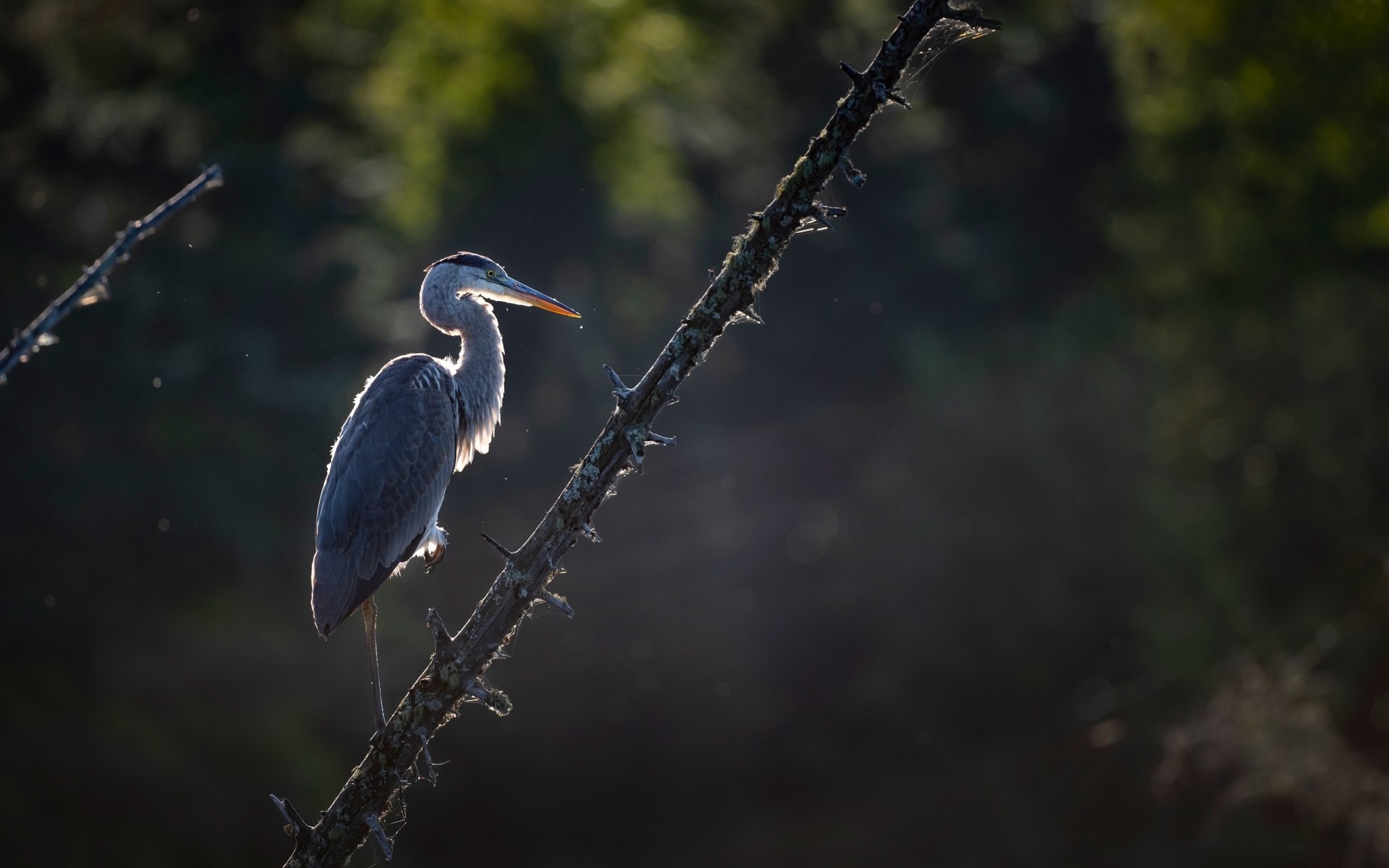 Description: A bird is perched on a branch in the sun light of the woods behind it is a tree with no leaves.