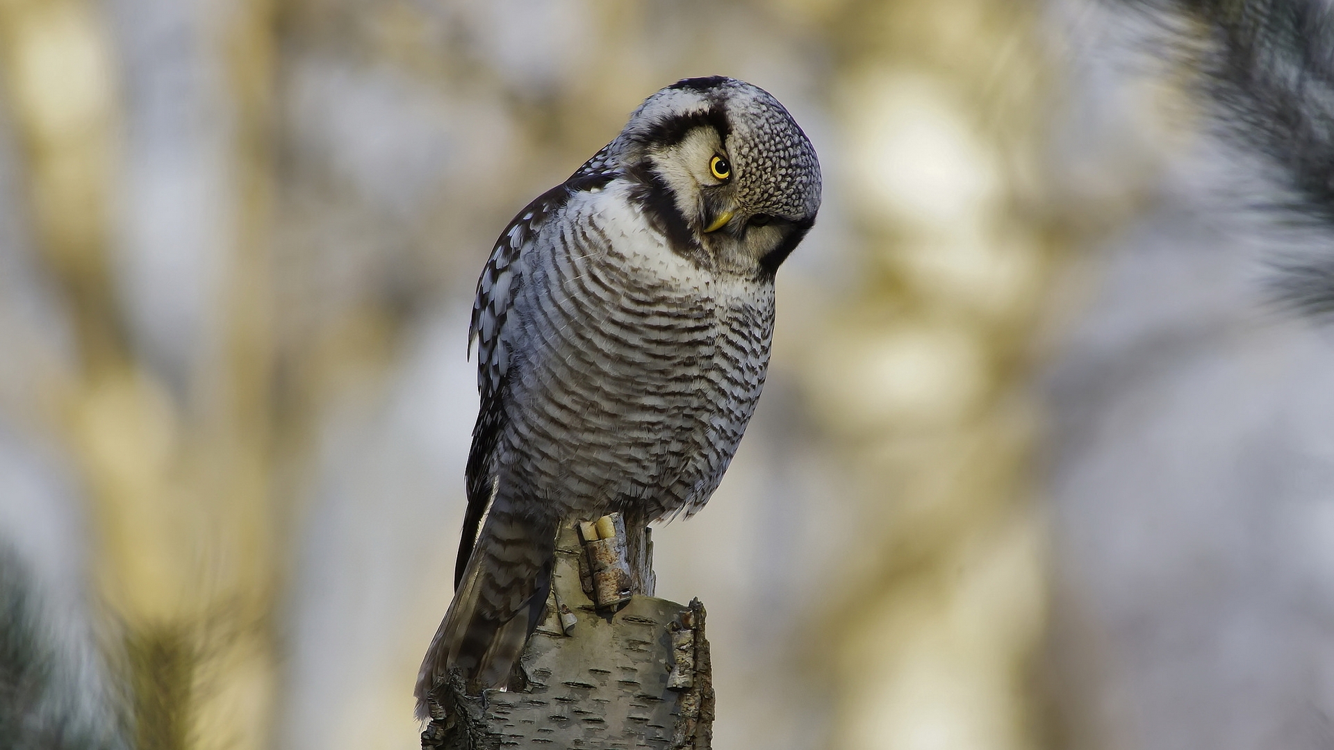 Description: A bird perched on a tree branch in a forest with trees in the background and a blurry sky.