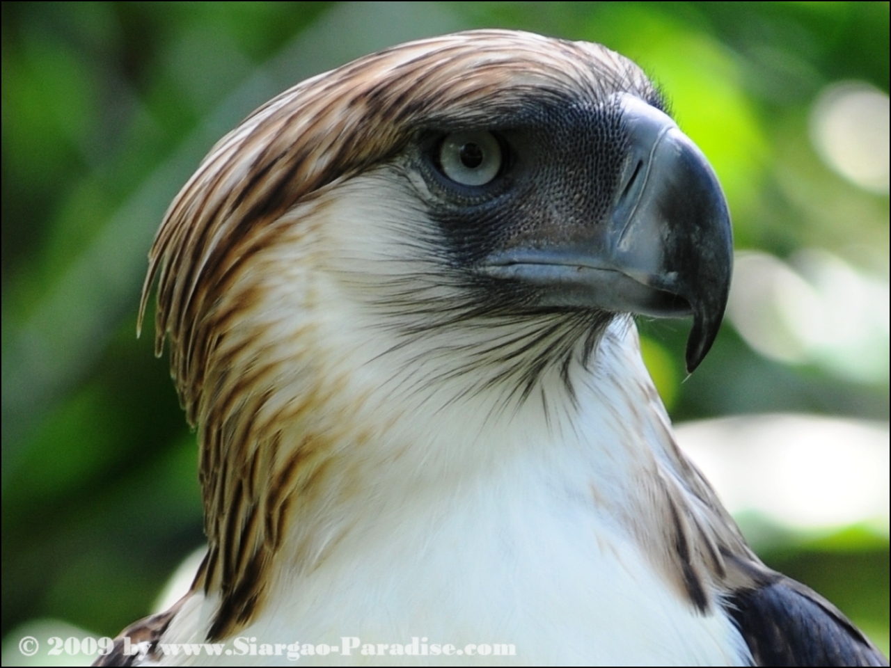 Description: A close up of a bird of prey with a blurry background of trees and leaves in the background.