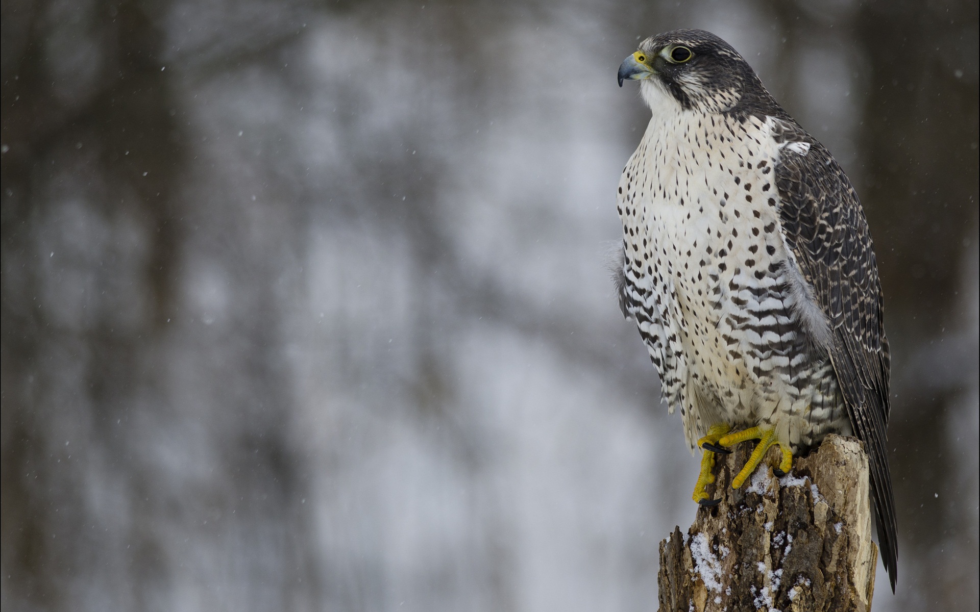 Description: A bird of prey sitting on a tree stump in the snow with a blurry background of trees and snow.