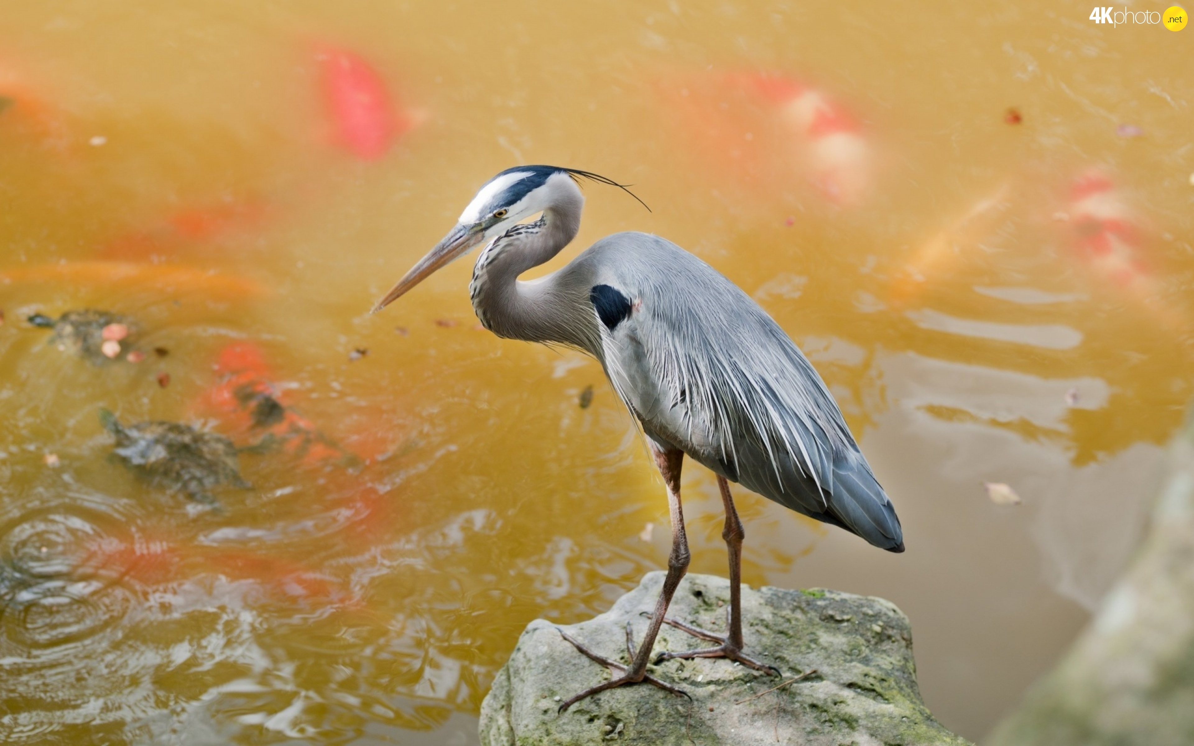 Description: A bird standing on a rock in front of a pond with fish in it's pond mouth and head.
