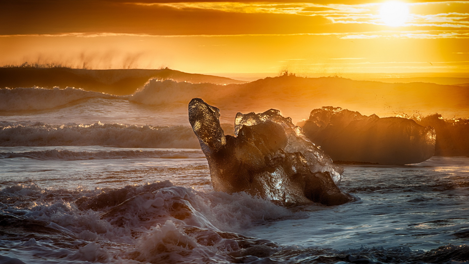 Description: A bird is standing on a rock in the water at sunset or sunrise time.