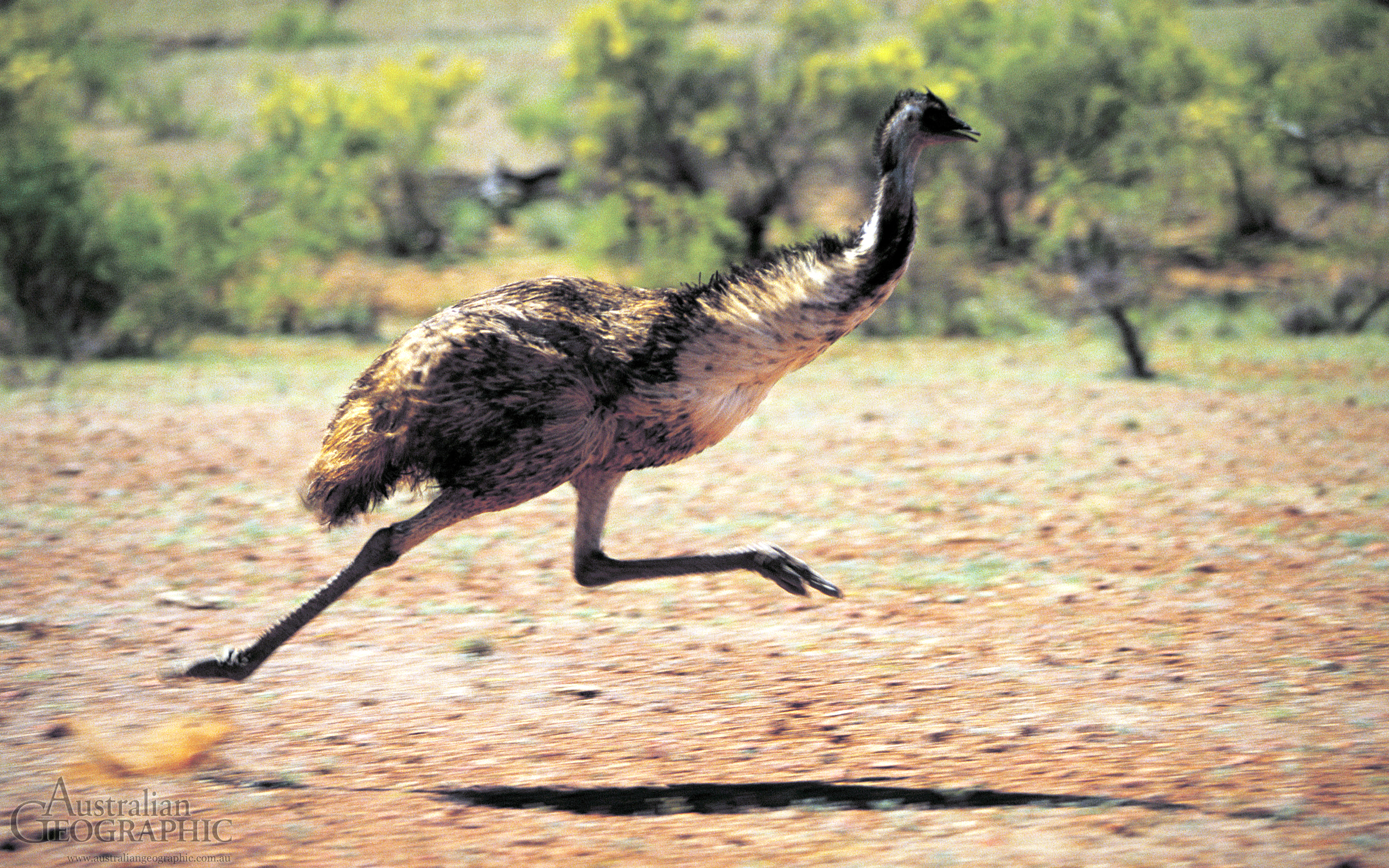 Description: A bird is running across a dirt field with trees in the background and bushes in the foreground.