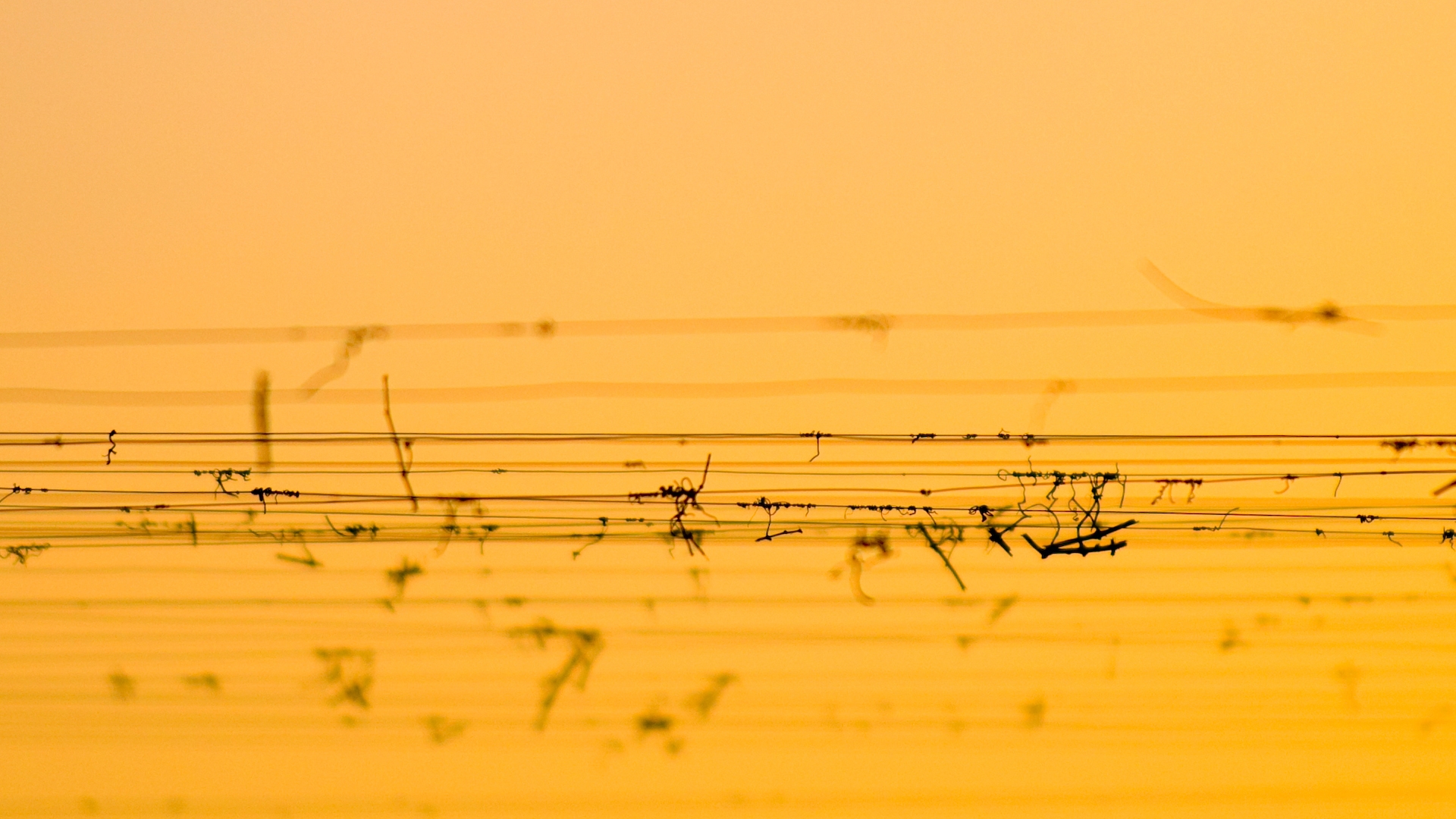 Description: A bird flying in the air at sunset or dawn with a yellow sky in the background and a line of barbed wire.