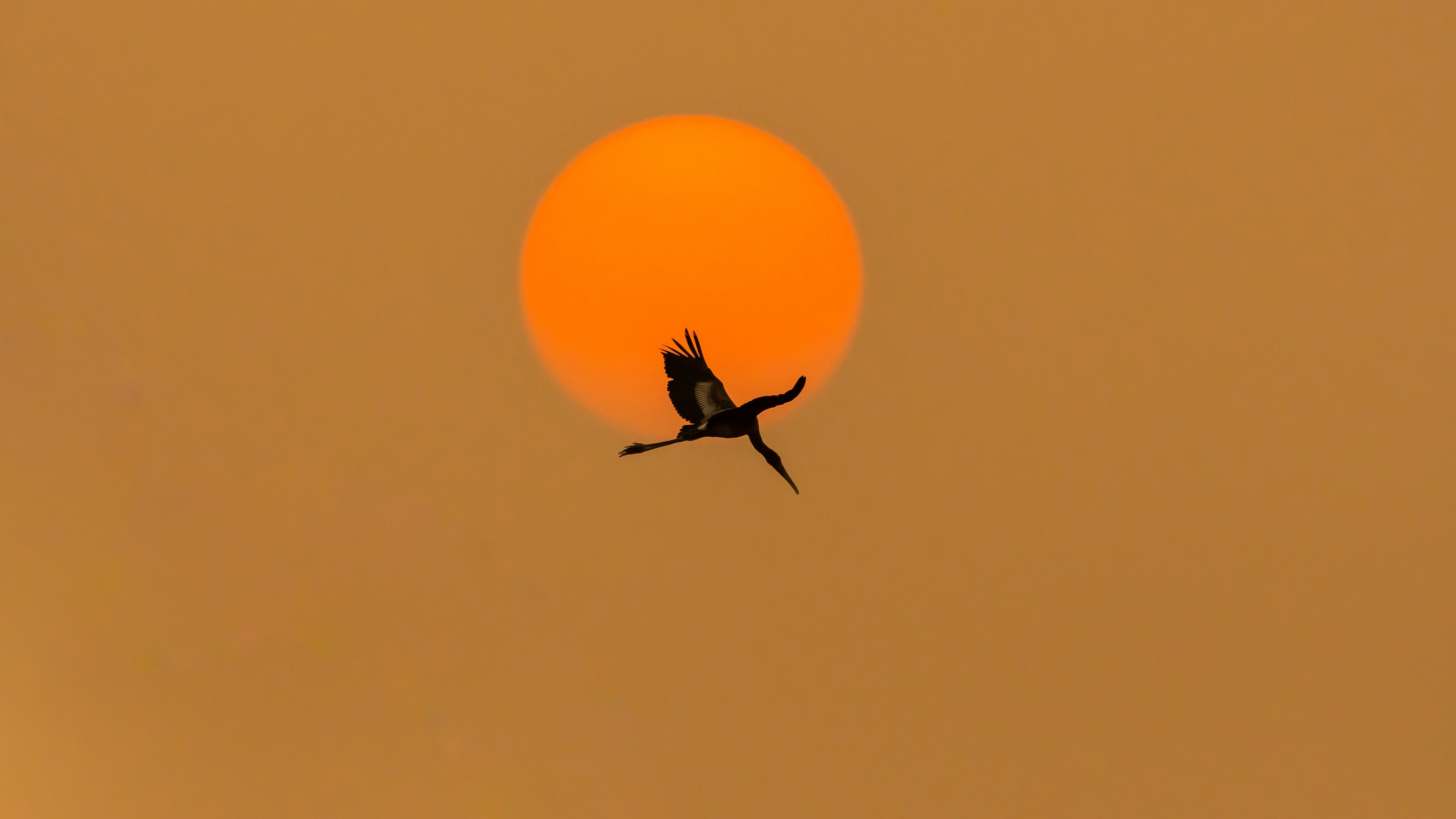 Description: A bird flying in front of the sun in the sky with a hazy background and a yellow sky in the background.