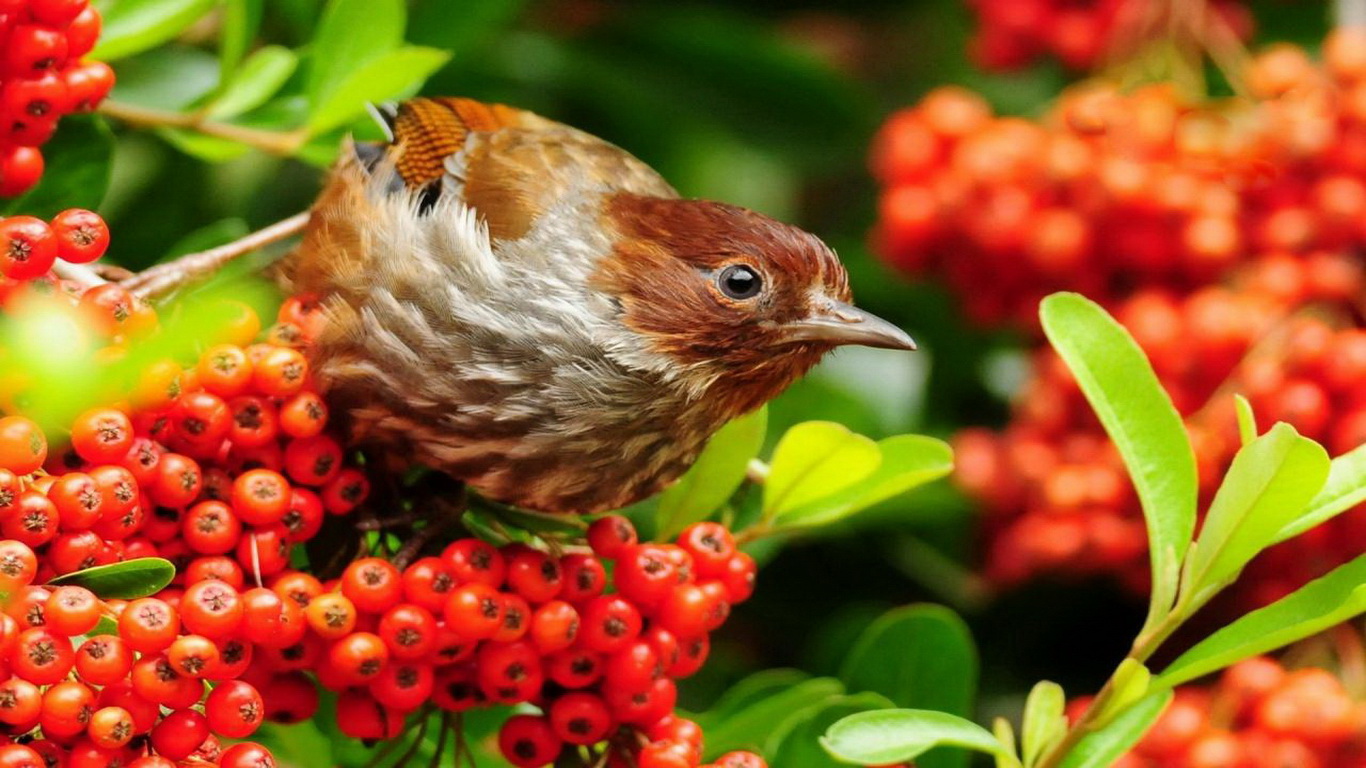 Description: A bird sitting on a branch of a tree with berries on it and a bird perched on the branch.