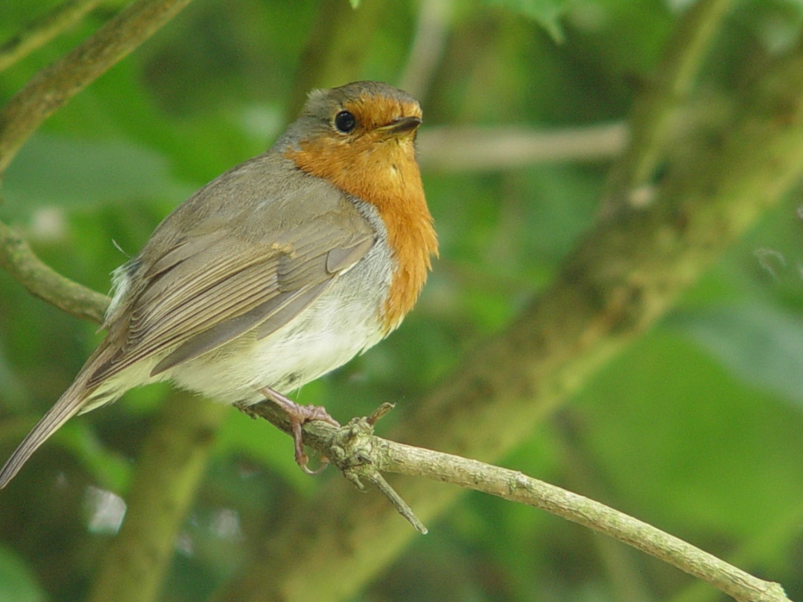 Description: A bird sitting on a branch in a tree with leaves in the background and a blurry background of leaves.