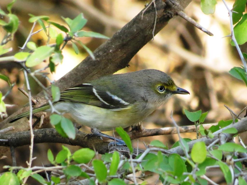 Description: A bird sitting on a branch in a tree with leaves around it and a blurry background of leaves.