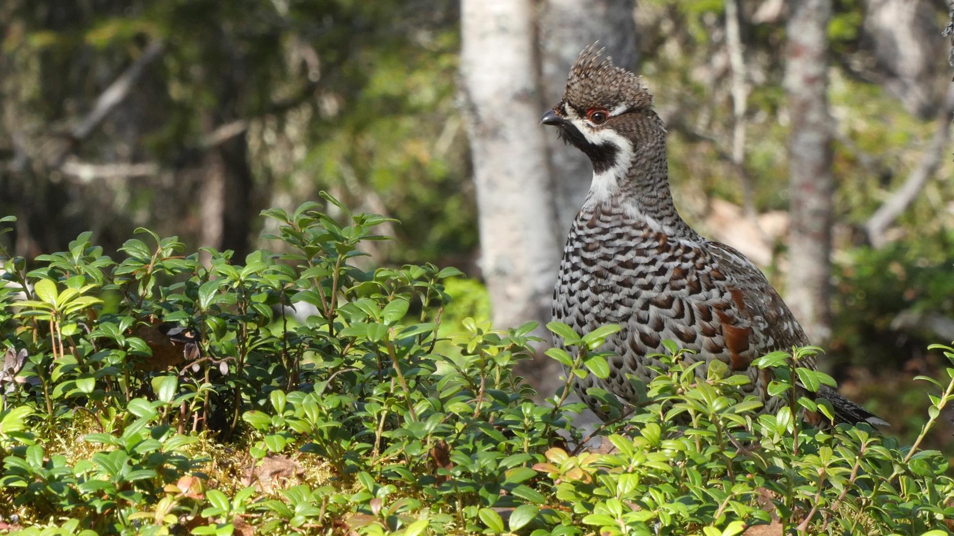 Description: A bird is standing in the bushes near trees and bushes in the woods.