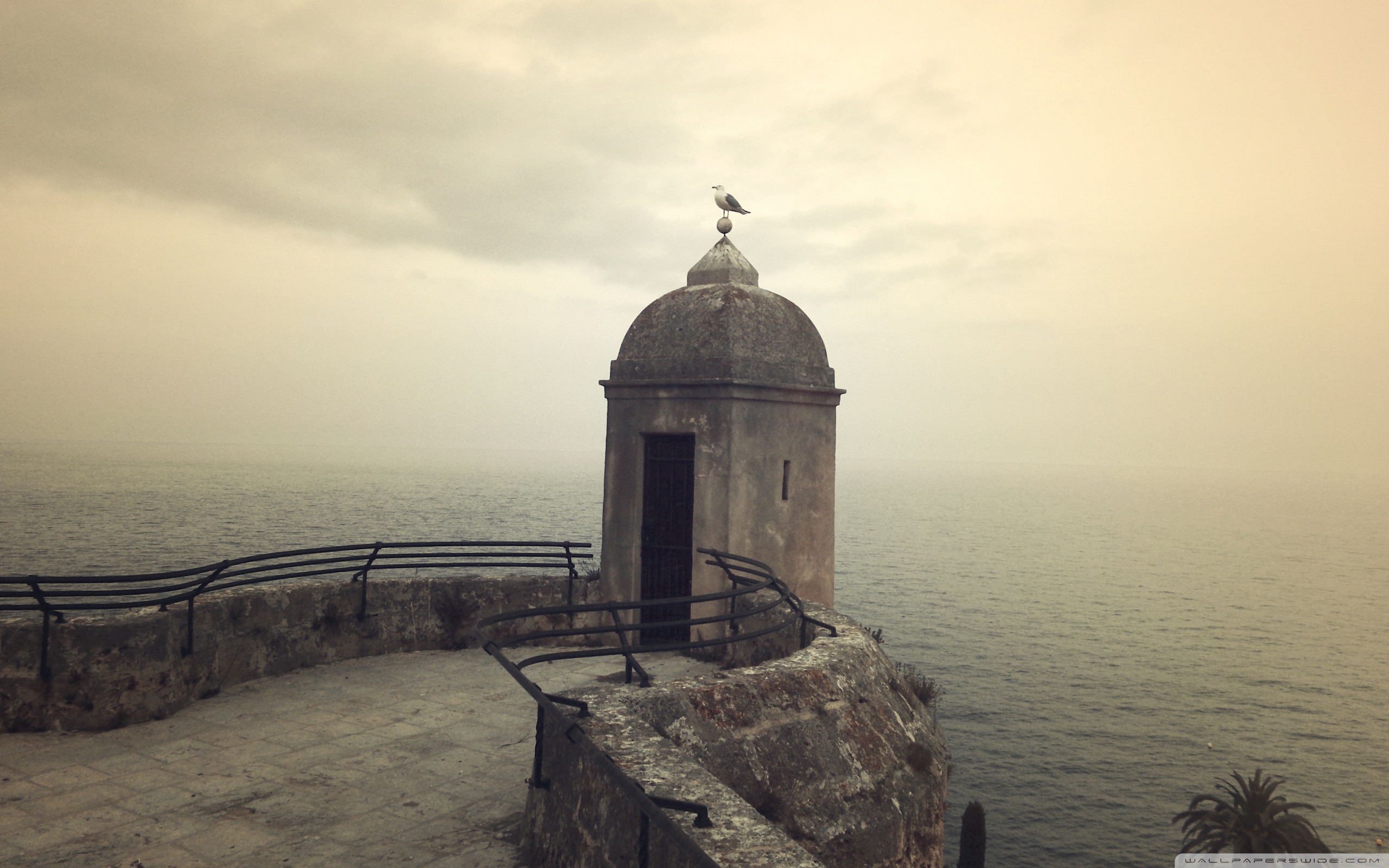 Description: A bird is sitting on top of a tower near the ocean on a cloudy day with a gray sky.